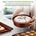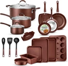 SEE-THROUGH LIDS: The oven safe non stick cookware is equipped w/ see through tempered glass lids w/ vent holes that allow steam to escape. Dishwasher safe cookware set effectively distributes & retains heat for even cooking w/ 500° max temperature COOL HANDLE GRIPS: The pots set features cool- ergonomic & heat-resistant handles ensuring comfortable & safe cooking. Offers sleek metallic design w/ anti-scratch polished stainless steel edges adding an elegant to the pots and pans NON-STICK SURFACE: This cookware set boasts a durable, PFOA/PFOS-free non-stick coating, ensuring effortless food release, easy cleaning, and healthier cooking. Its heat-resistant lacquer exterior stands up well to high temperatures. 20-PIECE SET: NutriChef 20-piece nonstick cookware set includes (6) bakeware set, 3 nylon utensils, silicone drainer, 8" 10" 12" open fry pan, 1.5 qt & 2.5 qt sauce pot w/ lid, 5 qt stew pot w/ lid, 9.45" grill pan, soup ladle, pasta fork, & spatula On Dec 15, 2024 at 18:42:53 PST, seller added the following information: