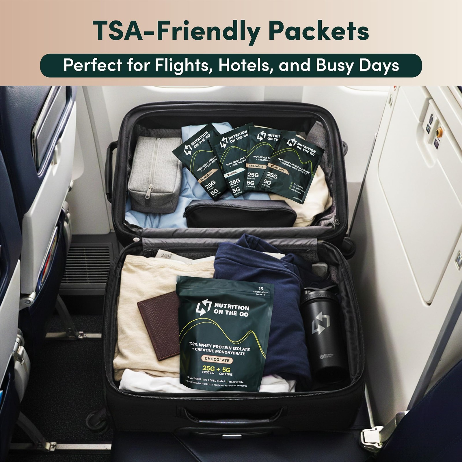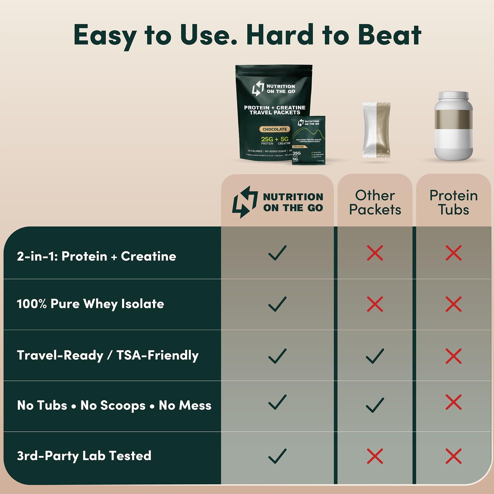 πŸ“ Product Description TRAVEL-READY PROTEIN PACKETS: Pre-measured single-serve packets designed for life on the go. TSA-friendly and easy to pack in carry-ons, gym bags, and backpacks so you never miss your protein while traveling, working, or training. Includes 15 individual chocolate packets.,PROTEIN + CREATINE 2-IN-1: Each packet delivers 25g of 100% whey isolate protein and 5g of micronized creatine monohydrate to support muscle, strength, and daily performance in one simple serving.,NO TUBS, NO SCOOPS: Skip the bulky containers and messy measuring. Tear open a packet, pour, shake, and go with perfectly portioned servings and zero cleanup.,NO CLUMPS, CLEAN TASTE: Mixes smoothly in water or milk with no clumps or gritty texture. Clean, easy-to-drink taste without the chalky texture common in many protein powders.,EASY TO DIGEST: Formulated with 100% whey isolate, which is naturally lower in lactose than traditional whey concentrates, plus digestive enzymes for smoother digestion and less stomach heaviness. Gluten-free and made without unnecessary fillers. πŸ“‹ Specifications size 15 Packets itemWeight 1.50 pounds manufacturer Nutrition On The Go productDimensions 8.5 x 2.0 x 11.0 inches βœ“ Fast Shipping | βœ“ Quality Guaranteed | βœ“ Customer Support 30-Day Returns β€’ 100% Satisfaction