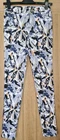 This is a pair of blue print canvas jeans in size Small 8/10 by the brand Sophyline. The jeans feature a geometric pattern, a zip closure, and a high rise waist of 28/30 inches. Made of cotton and elastane fabric with a medium wash, the slim-fit jeans have a skinny style and come with a 5-pocket design. They offer a slimming effect, stretch, and are machine washable, making them suitable for all seasons.