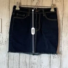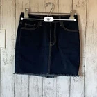O2 Denim Mini Skirt in dark denim. Crafted with 73% cotton, it offers a slight stretch for comfort. Worn only once, it's practically new and comes in size xtra small.