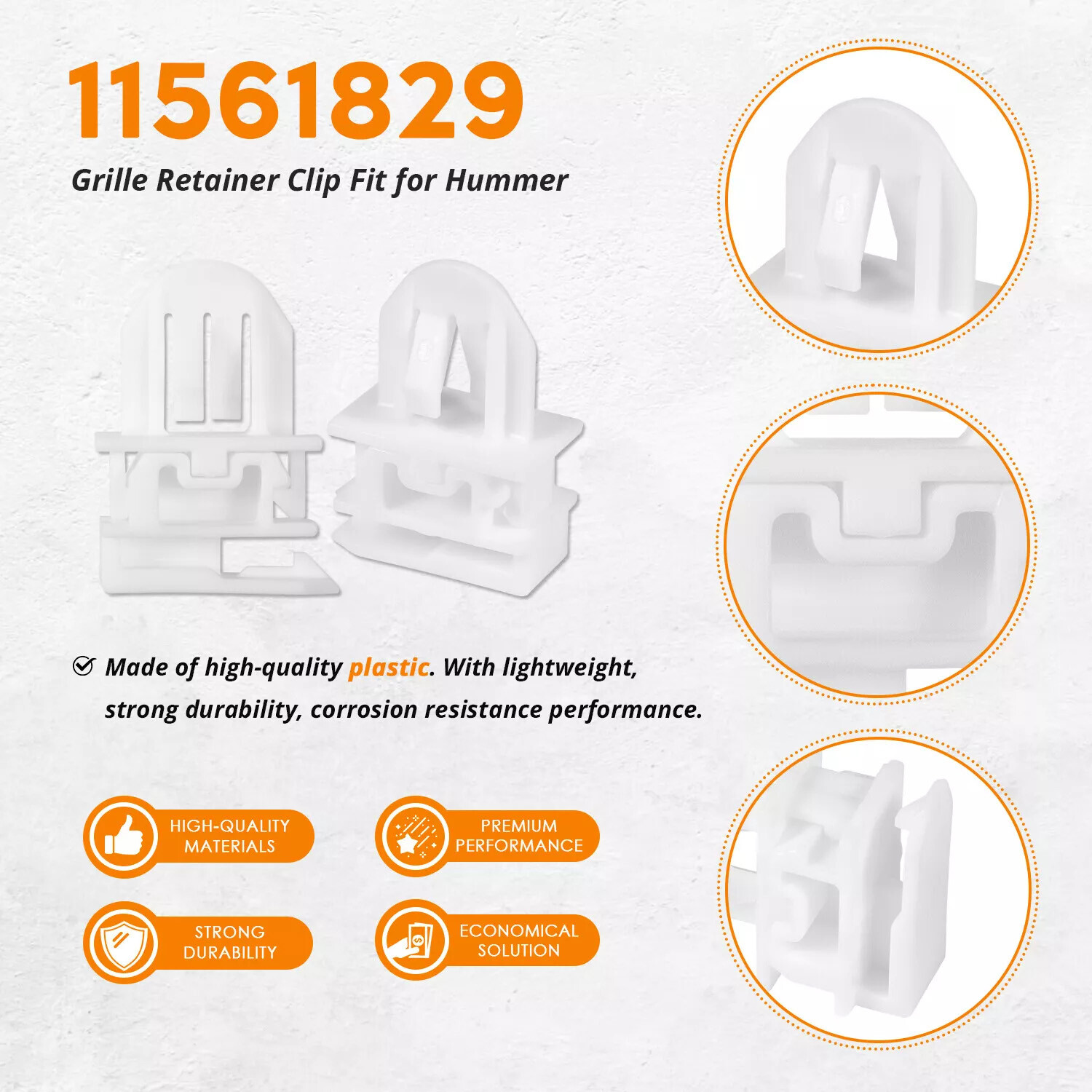 Fitment: Work for Hummer H3 2006,2007 2008, 2009, 2010 and Hummer H3T 2009, 2010 Grille Mounted Retainer Clip For 2006-2010 Hummer H3 Grille Mounted Retainer Clip For 2009-2010 Hummer H3T Grille Mounted Retainer Clip Part Number : 11561829 Package Including: 4 x Grille Retainer Clips Specification: Condition: New Material: ABS Plastic Color: White Size: 2.4x1.4x3.4cm / 0.94"x0.55"x1.34" (L*W*H) Features: Easy Installation OE/OEM Part Number: 11561829 Fitment Type: Direct Replacement Material: Plastic Placement on Vehicle: Left, Right, Front Color: White Type: Grille Assembly Clip Finish: White