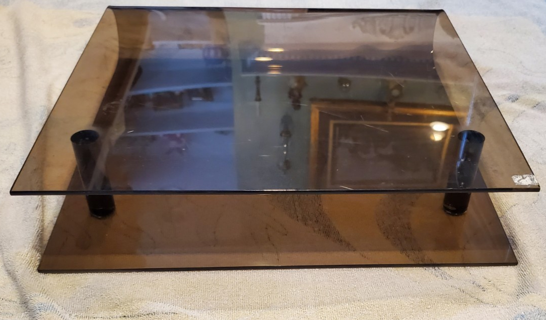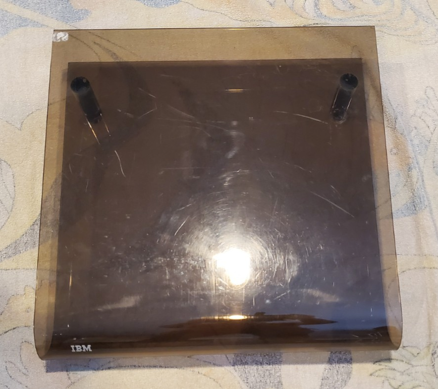 Vintage 1980s Genuine OEM IBM Acrylic Smoky Brown Plexiglass Printer Stand 16” x 16”. In good condition with no cracks. Could use a gentle cleaning.