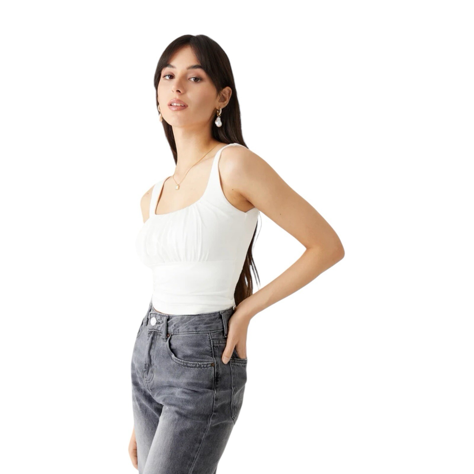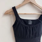 This tank is super comfortable and fits perfectly! The built-in bra provides great support without feeling restrictive, and the scoop neck is flattering. The ruch detailing adds a stylish touch, and the black color makes it easy to pair with anything. Lightweight yet supportive—perfect for layering or wearing on its own. Love that it’s new with tags too! Highly recommend for a casual yet put-together look.