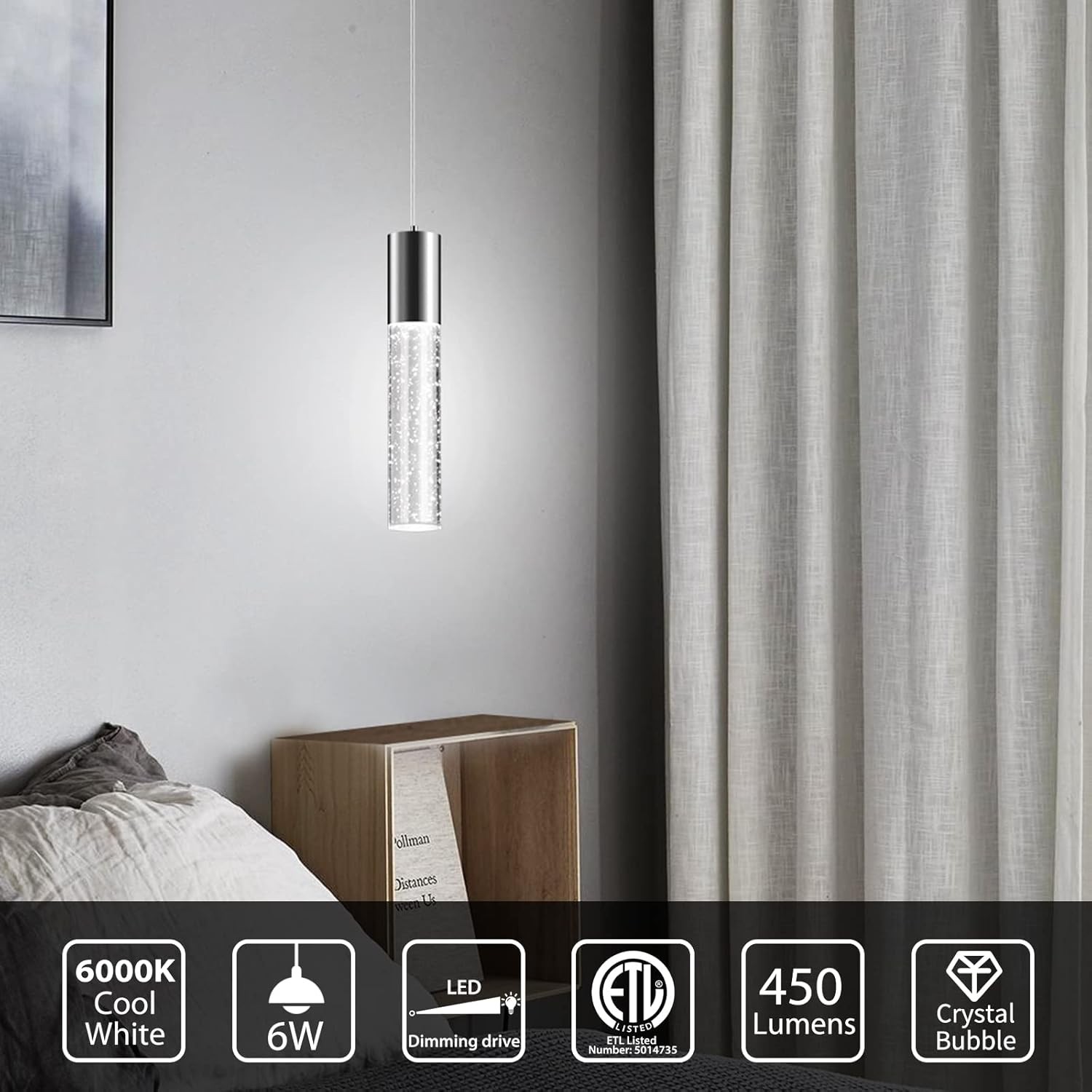 OKELI Modern Pendant Light, LED Bubble Crystal Kitchen Island 1P, Chrome-1P Product Details Brand: OKELI Color: Chrome-1P Material: Aluminum Style: Modern Light fixture form: Pendant Room Type: Kitchen Product Dimensions: 5.9"L x 5.9"W x 14"H Specific Uses For Product: Indoor use only Indoor/Outdoor Usage: Indoor Power Source: AC Installation Type: ceiling-mounted Special Feature: dimmable Control Method: App Light Source Type: LED Finish Type: electroplated Shade Material: Stainless Steel Number of Light Sources: 90 Voltage: 110 Volts (AC) Light Color: Cool White Shape: Cylindrical Included Components: Installation Kits Embellishment: Crystal Lighting Method: LED Specification Met: ETL Item Weight: 3.1 Pounds Number of Items: 1 Wattage: 6 watts Controller Type: Push Button Switch Type: Push Button Unit Count: 1.0 Count Brightness: 450 Lumen Efficiency: 75 lumens per watt Mounting Type: Ceiling Mount Shade Color: Chrome Fixture Type: Non Removable Assembly Required: No Manufacturer: OKELI Size: 1P Recommended Uses For Product: indoor Item Weight: 3.13 pounds Item model number: LD-12-61001 Finish types: electroplated Special Features: dimmable Plug Format: A- US style Batteries Included?: No Batteries Required?: No Bulb Features: Dimmable Color Temperature: 6000 Kelvin Color Rendering Index (CRI): 80.00 Product Dimensions : 1.8 x 1.8 x 9.8 inches; 3.13 Pounds Item model number : LD-12-61001 Manufacturer : OKELI Brand: OKELI Color: Chrome-1P Material: Aluminum Style: Modern Light fixture form: Pendant 【Simple Modern style】:Modern pendant light stainless steel sconces and cylindrical crystal bubble lamp posts will add more luxury, noble, and artistic atmosphere to your home, let your island light add a high-end atmosphere to your kitchen. 【Comfortable Island Light】:The pendant light fixture uses a 6-watt COB chip to emit a softer and more comfortable light, allowing you to completely relax and enjoy your food while dining. The LED pendant light is driven by an ETL certified dimmable, making your modern island light last longer. 【Rich use scenes】:Modern pendant lights are suitable for kitchen Island, dining room, bedroom, checkroom according to your home design style. It can also be used in clothing stores and bar counters. 【Size and dimmable】: Kitchen island pendant light cylindrical body diameter: 4.6 cm, height: 24.9 cm. The height can be adjusted from 24.93 cm to 119.9 cm. Pendant light fixture with ETL certified dimming driver, the light brightness can be between 10%-100%, but needs to be used with an adapted dimmer.
