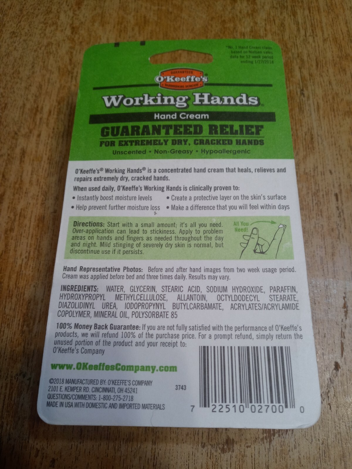 Weight: 2.7 oz gtin13: 0722510027000 Body Area: Hand Features: Alcohol-Free, Animal Cruelty-Free, Hypoallergenic, Unscented, Hydrating Sun Protection Factor (SPF): SPF 2 Period After Opening (PAO): 24M Main Purpose: Moisturizer Volume: 2.7 fl oz UVA Protection: 1-Star Brand: O'Keeffe's Size: Regular UPC: 0722510027000 Ingredients: Glycerin, Water, Argan Oil Formulation: Cream Color: Green GTIN: 0722510027000 Skin Type: Dry Skin