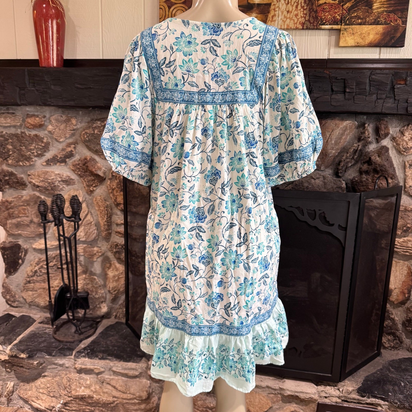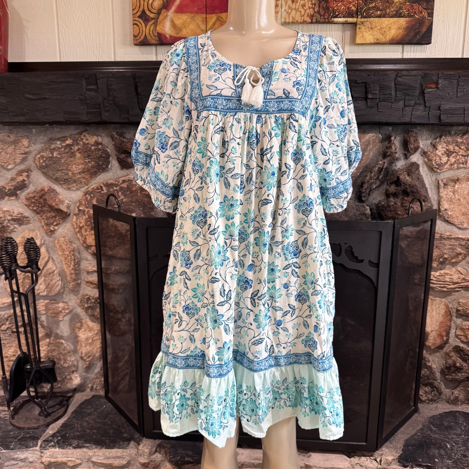 Old Navy Blue White Floral Short Puff Sleeves Pockets Tie V-Neck Mini Dress Size Large, NEW WITH TAG White and Blue Floral Print, Short Puff Sleeves, Tassel Tie V Neck, Half Lined, Tunic or Mini Length. Lightweight in 55% Cotton/45% Rayon Resortwear, Summer Vacation, Bohemian, Beachy, Island, Casual,