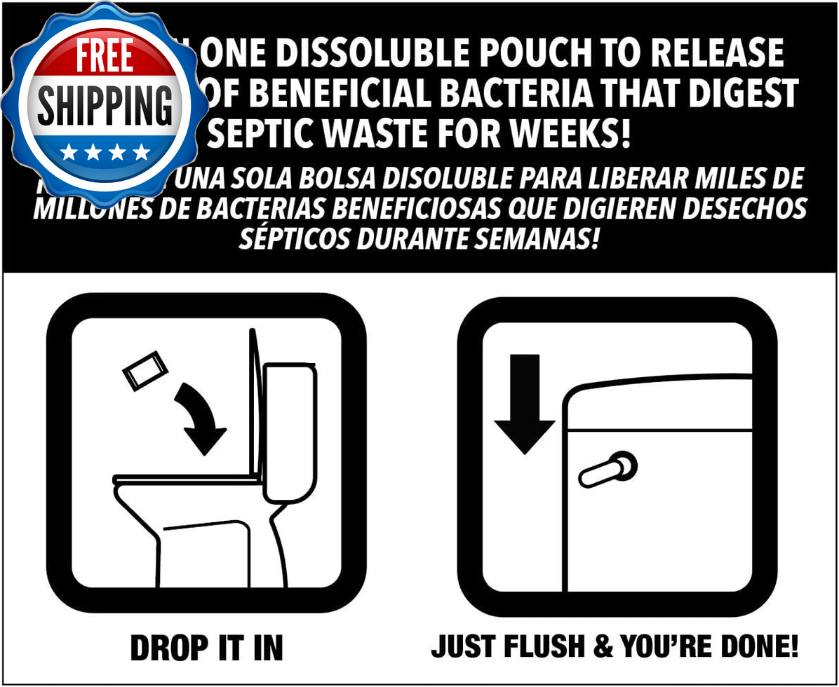ONE FLUSH - Septic Tank Treatment Packets, 3-Month Supply of Easy-Flush Bacteria & Enzyme Packets - Proactive Prevention for Sewage Backups, Made in the USA 3-Month Supply: Each ONE FLUSH packet delivers a robust blend of natural enzymes and billions of bacteria cultures, specifically formulated for monthly use. This 3-month supply of septic treatment is designed to prevent backups and sustain optimal functionality of your septic tank system, ensuring long-term efficiency and reliability. Versatile Septic System Care: Ideal for septic tanks, greywater systems, cesspools, grease traps and lagoons, ONE FLUSH septic saver packets work with all plumbing systems, including boats, RVs and campers, ensuring optimal waste breakdown and odor control. All-Natural Septic Solution: Trust in an environmentally friendly septic tank cleaner that's free from harsh chemicals. Each packet is packed with bio-genetically engineered bacteria that safely digest fats, oils, and organic matter. Cost-Effective Septic Maintenance: Avoid expensive repairs with ONE FLUSH septic treatment packets. Their concentrated formula is not only budget-friendly but also equals the power of hundreds of liquid septic treatments. Easy-to-Use Septic Treatment: Simply drop one dissolvable ONE FLUSH packet into your toilet each month and flush away. No mess, no measuring, and no hassle – just a straightforward approach to septic tank care. Industrial-Strength for Home Use: Originally crafted for municipal waste treatment, ONE FLUSH brings industrial-grade septic tank treatment to your home, boasting a formulation strong enough to handle heavy-duty use but safe for everyday residential systems. Product Description ONE FLUSH septic system treatment is your best choice for all your septic system needs. Use ONE FLUSH septic tank treatment enzymes / bacteria to break down organic matter to stay effective and efficient. Every time you shower, brush your teeth, wash clothes or even dishes you send high concentrations of pollutants into your septic tank or greywater system. Today's antibacterial products, disinfectants, deodorant soaps, toilet bowl cleaners, bleach, and even mouthwash kill the beneficial bacteria that are needed to keep your septic system working properly. ONE FLUSH was originally designed for industrial and municipal waste treatment facilities. Each pre-measured, dissolvable packet contains 56 billion beneficial bacteria and eight different strains of bio-genetically engineered bacteria digest and biodegrade proteins, starches, fats and paper. Unlike ordinary bacteria, ONE FLUSH bacteria also digest and biodegrade today's antibacterial products, disinfectants, deodorant soaps, toilet bowl cleaners, bleach, and even mouthwash that kill the beneficial bacteria that are needed to keep your septic system working. The efficiency and versatility of ONE FLUSH also make it essential for preventing and solving many problems around the kitchen, bathroom, laundry room. ONE FLUSH septic treatment packets can be used for septic tanks and grey water systems, cesspools, dry wells, leach fields, drains, garbage disposals, grease traps, outhouses, RV, Camper, pit toilets and Manure pits, lagoons and even to make compost for your yard and garden. The ONE FLUSH septic system treatment will totally protect your entire septic system by simply flushing our product into your system Each month. ONE FLUSH is the most powerful and effective bacteria available on the market and is good for septic tanks up to 1500 gallons. A recent analysis revealed that 1 packet of ONE FLUSH septic treatment is equal to 141 bottles of a competitors 8 oz. Liquid septic tank treatment. From the Manufacturer A monthly maintenance approach using One Flush prevents problems, restores your system, biodegrades pollutants before they enter the environment. Easy to use and store, just drop and flush. Good for tanks up to 1500-Gallon. Shipping Fast shipping is very important for us. Our standard US shipping service is FREE. Your order will be shipped within 2-3 business days upon full payment received. Your order will be delivered within 2-3 business days after the handling time. We only ship to the confirmed PayPal address. We reserve the right to cancel any order for any reason at any time. We are not responsible for undeliverable addresses. Returns and payment We offer a 30 days return policy from checkout winning date. We allow only PayPal as payment method FeedBack Your feedback very important to us, after you get your package and you are satisfied with our service please leave us positive feedback If you have any problem with your order / any questions please before leave any type of feedback For any questions, using eBay contact system Please visit our eBay store to check out other items for sale! Thank you for shopping at our store.
