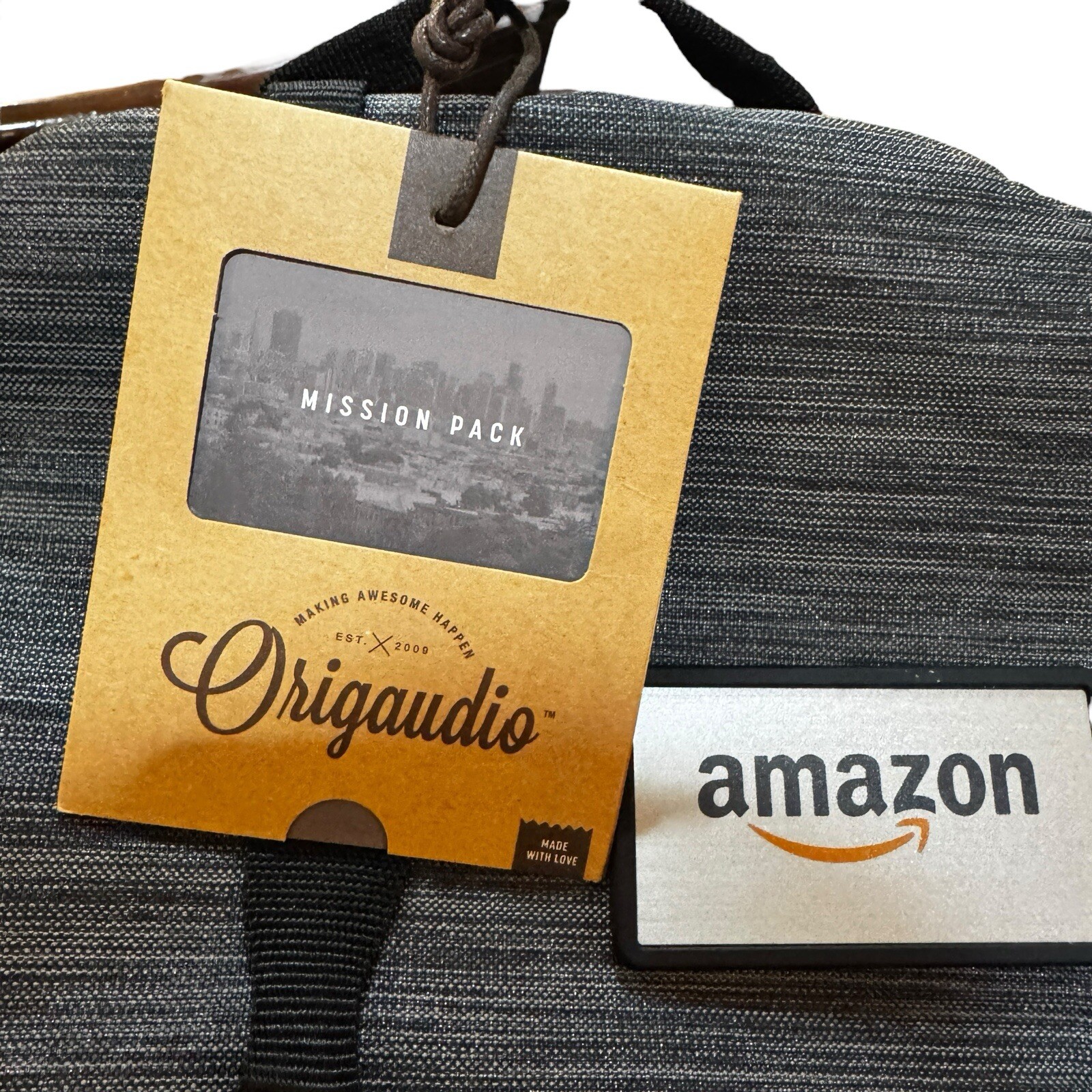 NWT ORIGAUDIO Mission Pack Laptop Backpack Tech Work Bag Cooler Amazon Logo New with tags - never used. Has a brushed aluminum AMAZON logo plate attached to top flap. Large front pocket is insulted like a lunchbox cooler.