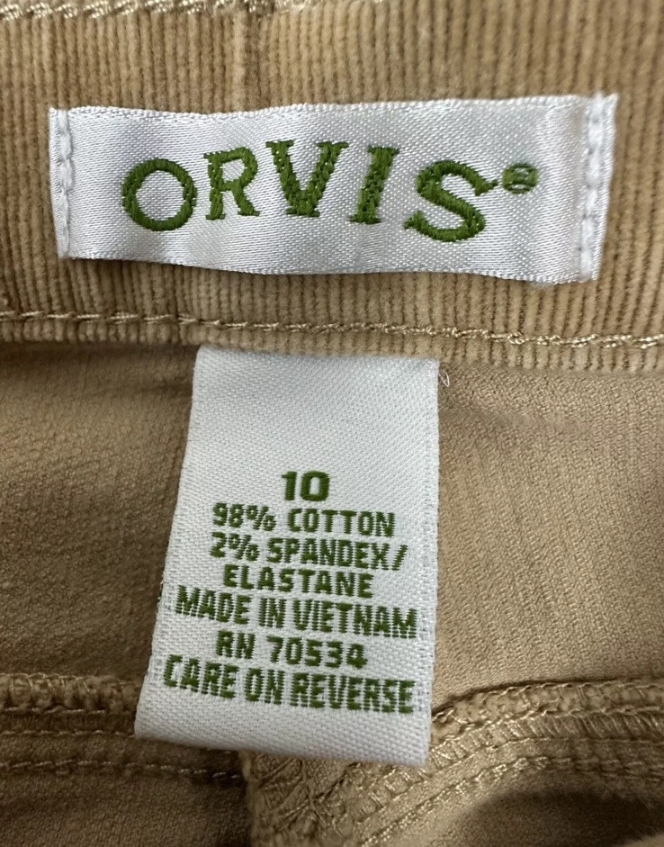The ORVIS Corduroy Pants in women's size 10 offer a classic straight leg style in a versatile khaki tan color. Made from a comfortable cotton blend fabric with a touch of spandex for stretch, these pants feature a high rise waist and flat front design with a zip closure. They are suitable for various occasions including travel, casual outings, and business meetings, making them a stylish and practical wardrobe staple for all seasons. With a timeless solid pattern and convenient pockets, these Orvis pants are a must-have for any woman looking for both style and comfort in her everyday attire.