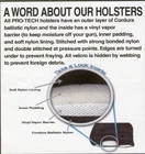Visit My eBay Store: D&T Holster Store 30 day Money Back Guarantee If for any reason your satisfaction is not complete you may return the item and we will gladly give you a refund for that item. We believe in the quality of Pro-Tech Holsters, that is why we offer a 30 Day Money Back Guarantee. Model # WSB-32 PRO-TECH SIDE HOLSTER DESCRIPTION: Gun holster for Taurus 94 (9 Shot) With 5" Barrel by Pro-Tech Outdoors. This specially designed gun holster isn't tapered like most gun holsters - and will accommodate many different configurations of Revolvers. It also features an adjustable thumb break and easily clips onto a belt or your pants (belts up to 2 inch wide). The holster also has a built-in belt loop so you can use it without the metal clip-on device if desired. It's made of durable black nylon w/black nylon stitching and the it's adjustable so the holster can be worn on the left or right side - for left or right-hand draw. Gun Holster Features: - Adjustable for right or left-hand draw. - Gun holster can clip onto your belt or you can use the belt loop built into the holster. - Made of durable nylon with padding. - Pro-Tech Outdoors brand. - Features an adjustable thumb break for secure retention and custom fit. Jesus is the way, the truth and the life! When you follow Him you’ll be blessed beyond measure! God says that He will give you abundantly more than you can even ask for or imagine. He really wants to bless you! You’re His child, He loves you so much! John 14:6 God Bless Feedback From Buyer Date/time Excellent z****u ( 207 ) 2017-10-08 16:36:13 Great Transaction !! Thank You!! j*******4 ( 656 ) 2017-10-08 14:24:12 Excellent Ebayer. Super quick shipping t*******r ( 70 ) 2017-10-08 14:23:10 Thanks, went smooth 2******9 ( 883 ) 2017-10-08 13:29:14 Awesome items. Great Ebayer. Fast shipping 4**********4 ( 1211 ) 2017-10-08 11:20:53 Awesome items. Great Ebayer. Fast shipping 4**********4 ( 1211 ) 2017-10-08 11:20:44 Awesome items. Great Ebayer. Fast shipping 4**********4 ( 1211 ) 2017-10-08 11:20:34 Very fast delivery great seller thank you. s********9 ( 227 ) 2017-10-08 00:13:47 Great thanks 😃 g*********5 ( 107 ) 2017-10-07 18:33:40 THANKS r********2 ( 353 ) 2017-10-07 15:51:21 Great! s*************2 ( 86 ) 2017-10-07 15:38:27 Great transaction......fast shipping! AAAA++++ h*********6 ( 123 ) 2017-10-07 14:43:34 The description was spot on, quick shipping and great service. A++++ k****d ( 226 ) 2017-10-07 13:40:08 Thank you!!!! b*********5 ( 237 ) 2017-10-07 07:41:50 very fast delivery,great product!!! h********7 ( 110 ) 2017-10-07 03:05:28 Great seller i*******3 ( 260 ) 2017-10-06 20:34:53 Just as described. Thank you. j********u ( 860 ) 2017-10-06 17:58:31 Exactly what I want d**j ( 1413 ) 2017-10-06 17:13:43 Great price and product fast delivery thank you. f*********e ( 574 ) 2017-10-06 15:07:36 smooth and easy transaction. would recommend t*********3 ( 71 ) 2017-10-06 12:53:42 Track Page Views With Auctiva's FREE Counter