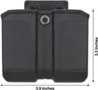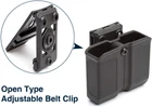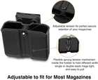 Lightweight & Durable: Double magazine holster is made of heavy-duty high-tech Polymer, with superior withstanding of strong impact forces & extreme temperature environments. It’s lightweight, sweat resistant, and can be easily cleaned. Total weight: 5.2 oz. Inner length 3.25 inches, inner width 1.25 inches. No Magazine Included Universal Fit: Fits most 9mm / .40 / .357 calibers dual stack magazines of different width with its unique inner built-in sprung tension mechanism. Fits mags of Glock 17/17L/18/19/19X/22/23/24/26/27/31/32/33/34/35/43/43X/45/48, Smith & Wesson M&P M2.0 Series, M&P SHIELD M2.0 Series, M&P SHIELD Series, M&P SHIELD EZ Series, SD Series(SD9 VE, SD40 VE), Sig Sauer P210/P225/P226/P229/P250/P320/P365/P938/SP2022, Springfield, Taurus, Beretta, Ruger, Walther, Canik, Colt, CZ, H&K Unique Belt Clip: Adjustable belt clip is compatible with gun duty belt width from 1.25 to 2.25 inches. Open type belt clip allows one step open, and one step close Adjustable Carry Angle: Pistol magazine holder can rotate 360° to your comfortable position, with a simple adjustment on only one screw with included Allen Wrench. Mag pouch carrier is ambidextrous for both right hand & left hand Adjustable tension for perfect secure retention of your magazines. Designed for Military, Law Enforcement, Police Officer, and Civilian Use Fits most 9mm / .40 / .357 calibers double stack magazines of different width with its unique inner built-in sprung tension mechanism. Please find the compatible pistol magazines below (DO NOT fit for single stack magazines or any .45 calibers mags): Glock: G17, G17L, G18, G19, G19X, G22, G23, G24, G26, G27, G31, G32, G33, G34, G35, G43, G43X, G45, G48 Smith & Wesson: M&P M2.0 Series, M&P SHIELD M2.0 Series, M&P SHIELD Series, M&P SHIELD EZ Series, SD Series Sig Sauer: P210, P225, P226, P229, P250, P320, P365, P938, SP2022 Springfield Armory: XD Series, XD-M Series 9mm / .40, Hellcat Series Taurus: 92 Models, G2c Models, G3c Models, G3, PT111 Series, PT800 Series, TH9 Models, TH40 Models Beretta: APX Models, M9 Models, Px4 Storm Models, 92 Models Ruger: EC9s, LC9s, P95, SR9c, SECURITY-9, Ruger American Pistol Walther: P99, PDP, PPQ M1, PPQ M2, PPQ Classic, PPS, PPS M2, Q5 MATCH SF Canik: TP9SFX, TP9 SF Elite-S, TP9 SFT, TP9SF ONE Series, TP9SF Elite ONE Series Colt: Defender Series, Commander Series, S70 Government, Competition Series 9mm, Gold Cup Series 9mm, Rail Gun Series, Combat Elite Series 9mm, Combat Unit Series, Wiley Clapp Series CZ: P-01, P-07, P-09, P-10 C, P-10 F, 75 B, 75 Compact, 75 SP-01, Shadow 2 Heckler & Koch: USP, VP9, VP40, P30, P30L, P30SK, P2000