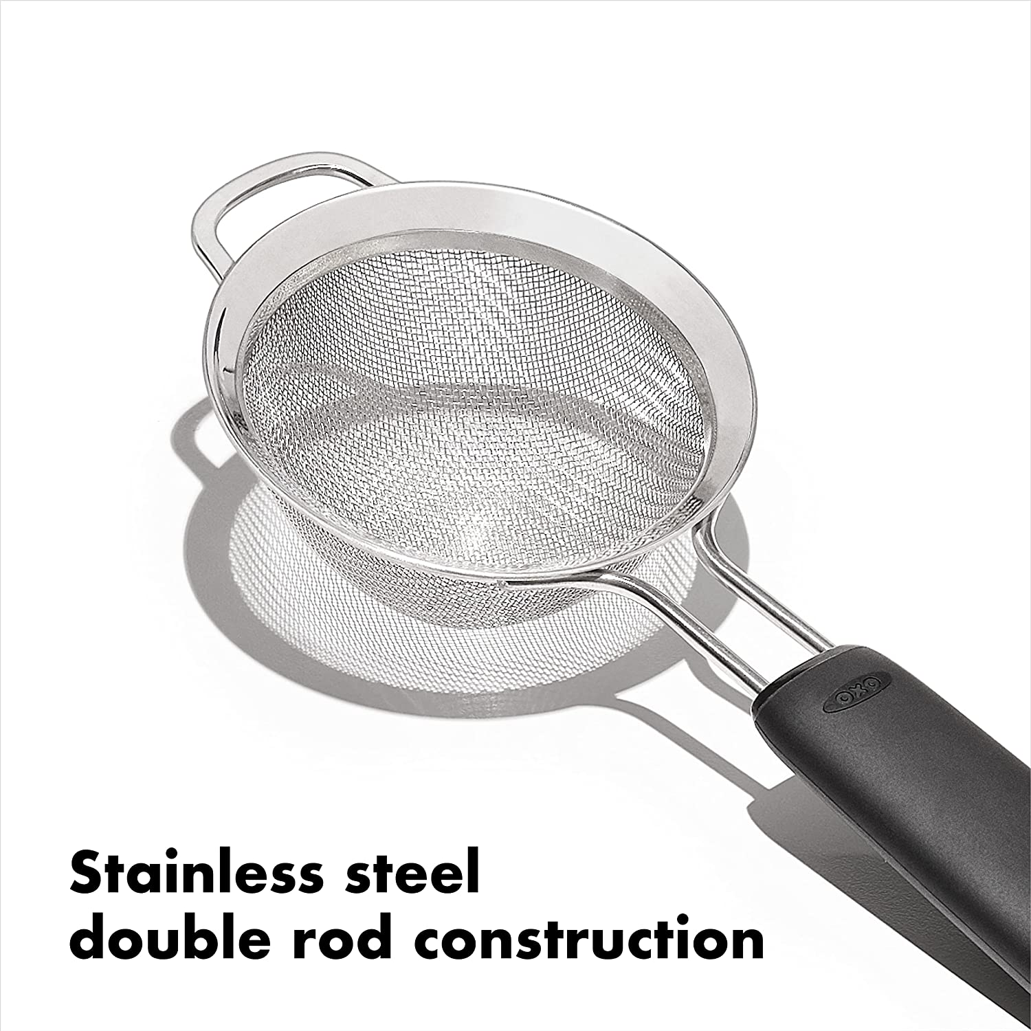 Fine mesh for straining citrus juice, dusting powdered sugar, steeping loose leaf tea and other tasks Extra-sturdy stainless steel double rod construction Secure loop keeps Strainer stable on mugs or bowls Handle won’t slip, even when wet Dishwasher safe Also available in 6-Inch and 8-Inch sizes The OXO Good Grips 3-Inch Mini Strainer is ideal for smaller straining jobs like straining seeds from citrus fruits, dusting powdered sugar and steeping loose leaf tea. The stainless steel double rod construction makes it extra sturdy, and a balancing loop lets it rest securely over containers while you work. The soft, comfortable handle won't slip, even when wet. Dishwasher safe.