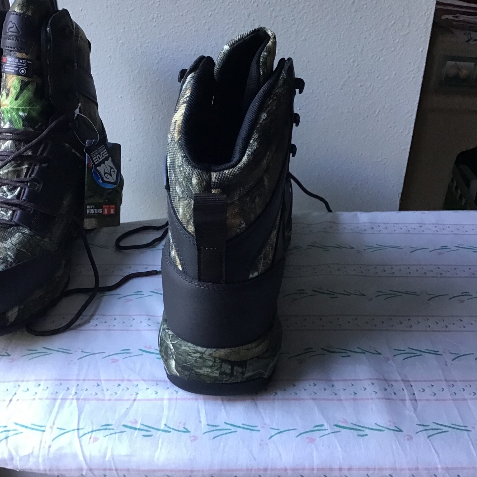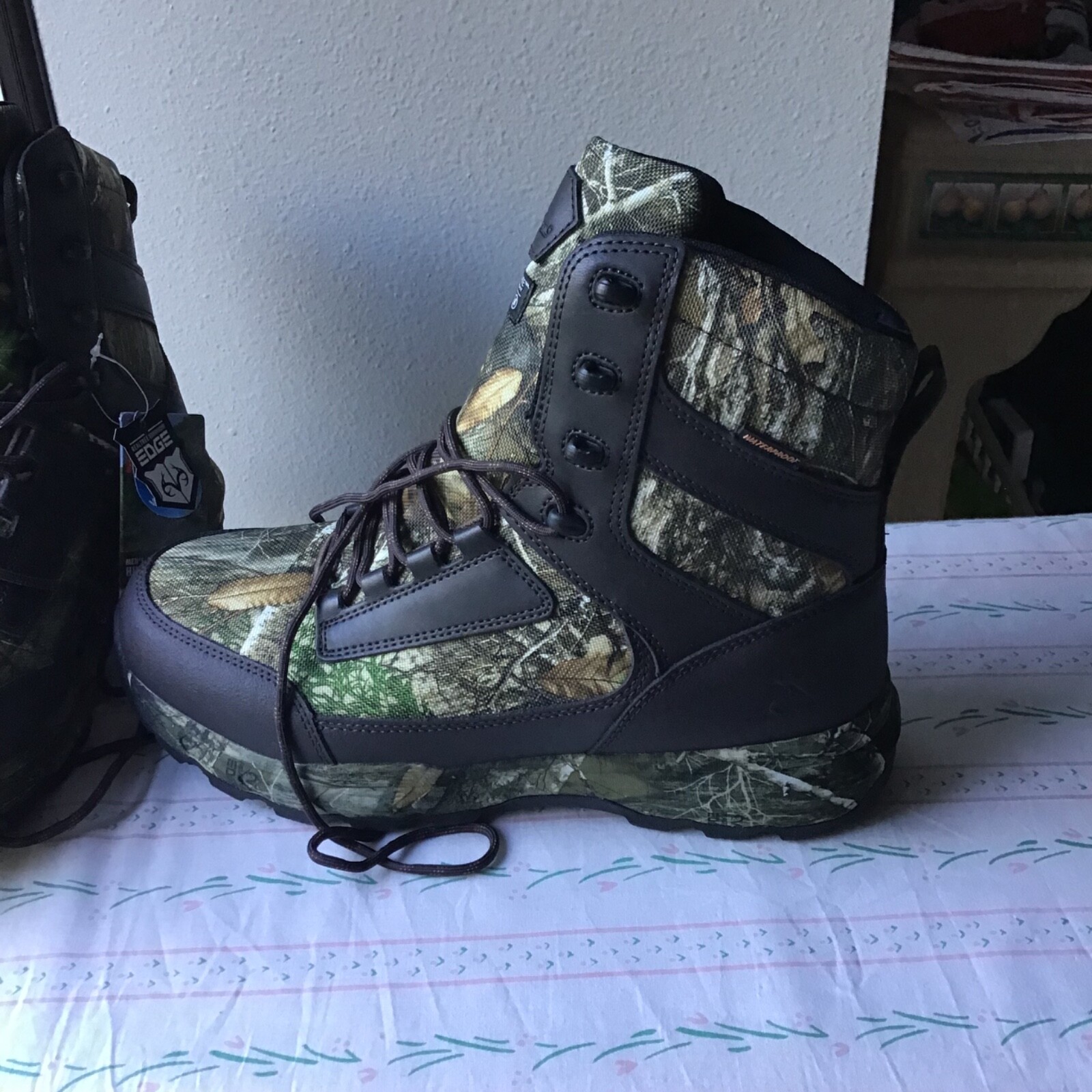The Waterproof 8-Inch Ozark Trail Camouflage Hunting Boots are the perfect fit for any type of hunting. These hunting boots are designed with genuine leather and have RealTree™ Camo prints to help you blend in with your surroundings while hunting. With Thinsulate™ insulation for warmth and an ergonomic foam footbed for all day comfort, these boots feature eight inches of ankle support that’s ideal for extended wear when you’re in the great outdoors. Shoe Closure: Lace-up boot for a snug and secure fit Materials: Breathable leather and mesh upper with an insulated and waterproof body End Use: Built for hunting, walking, and being in the outdoors for extended periods Features: Realtree; camoflauge print, insulated interior, waterproof bootie Clean & Care: Do not wash Country of Origin: China Thank you for looking. Smoke free home.