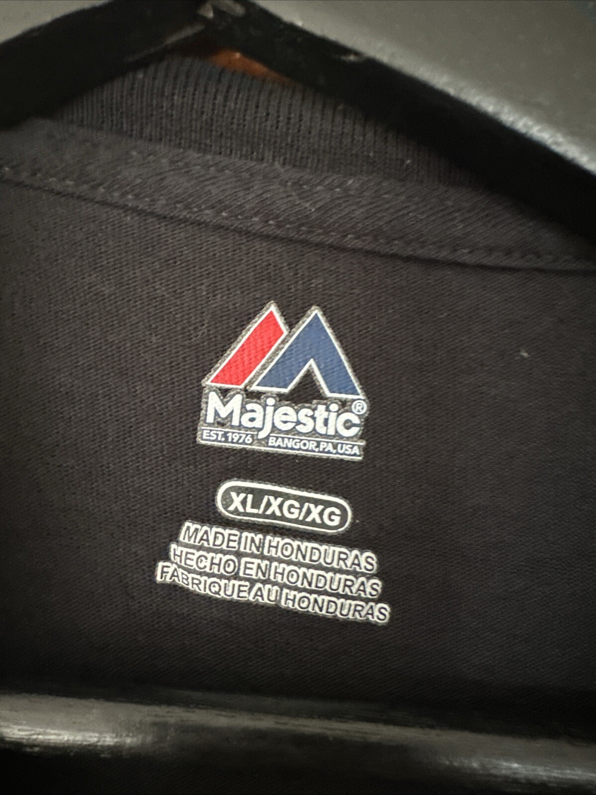 Show your support for the Oakland Raiders with this officially licensed Majestic brand cotton t-shirt. The black unisex shirt features the team's iconic logo and is perfect for fans of the National Football League (NFL). Made in Honduras, this shirt is available in size XL and is ideal for regular season games. Whether you're cheering from the stands or watching from home, this shirt is a must-have for any true Raiders fan. It's made from high-quality materials and is designed to be comfortable and durable. Get yours today and show your pride for the Oakland Raiders!