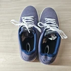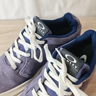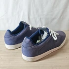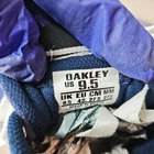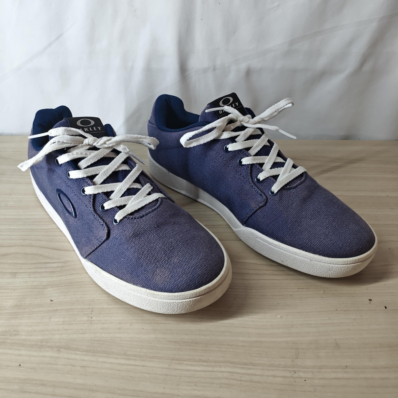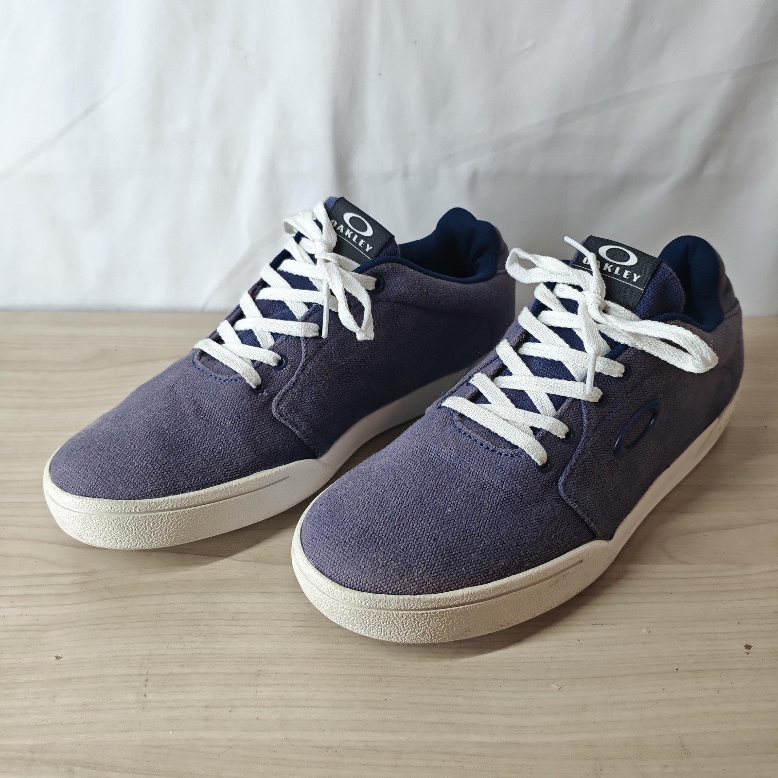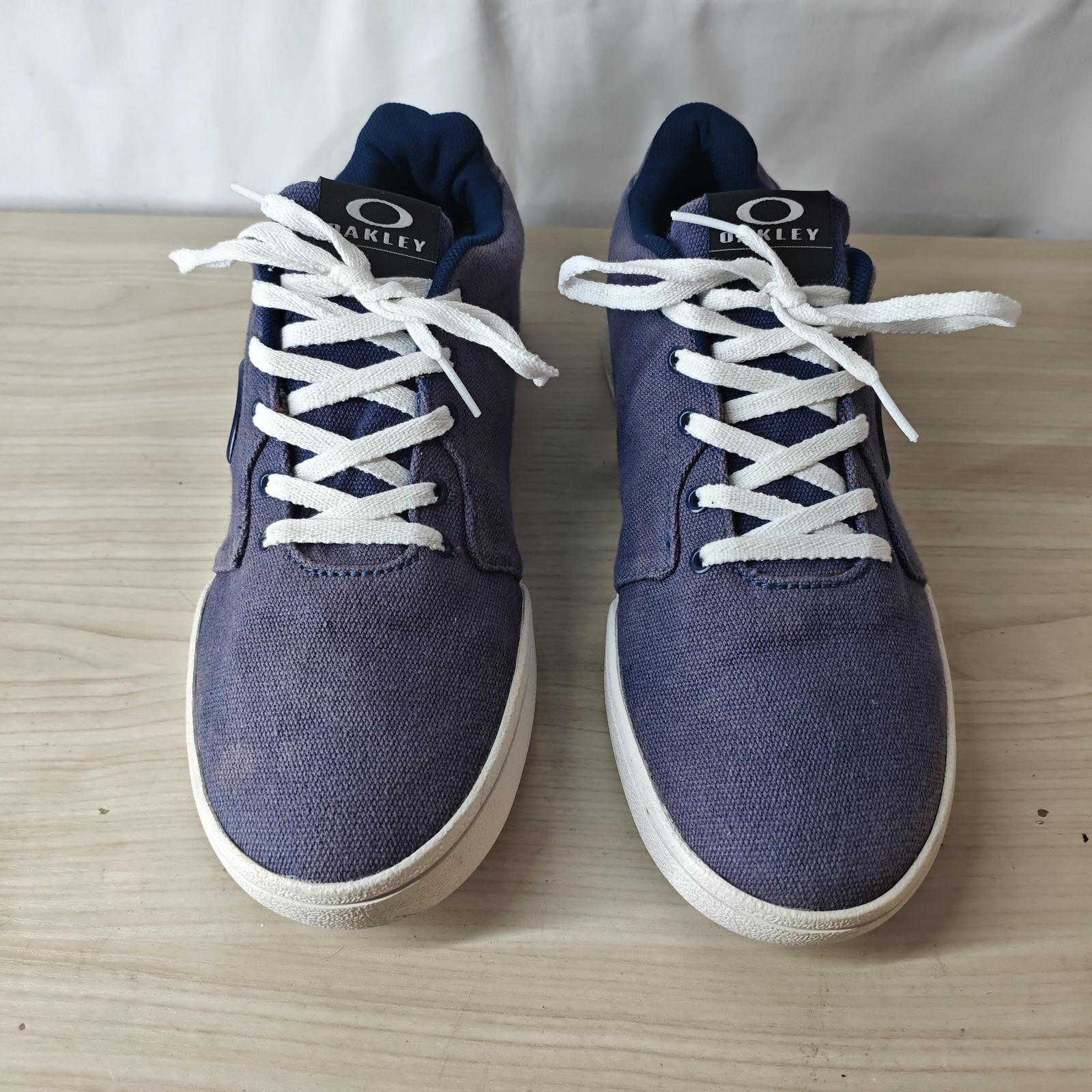 Brand: Oakley Style: Mens casual low-top sneakers with blue cotton canvas uppers, white rubber soles, and classic Oakley O logo details on the sides, heels, tongues, insoles, and outsoles. Color: Blue upper with navy lining and white laces and midsoles. Materials: Cotton canvas upper, fabric lining and insole, cushioned and padded interior, rubber outsole. Size on tag: Mens US 9.5, UK 8.5, EU 43, 27.5 cm (275 mm). Country of manufacture: Made in Brazil. Style/Model code (per inner tag): 13551-6Z2. Details: Lace-up closure, low-top profile, lightweight cushioned feel, textured rubber outsole for grip, breathable canvas construction suitable for everyday casual wear.