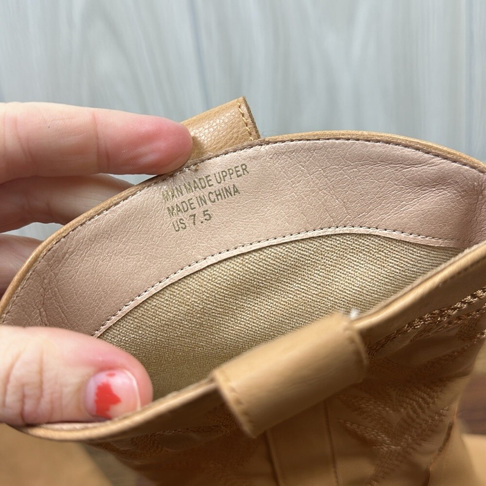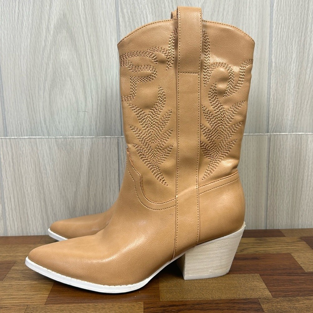 Oasis Society Womens Cowgirl Boots 7.5 Tan Point Toe Mid Calf Contrast Western Weight: 2.2lb Size of item: 7.5 Condition: Good preowned condition. This has been worn. No flaws, stains or tears. Ships from a smoke free home! Please see all photos for exact item condition Thanks for checking out my store! All items are shipped within two business days. Make a bundle to save on shipping cost.