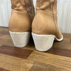 Absolutely love these boots! The tan leather is gorgeous, and the contrast stitching gives them a stylish western vibe. They fit perfectly—true to size—and are super comfortable right out of the box. The pointed toe and mid-calf height make them versatile for jeans or dresses. Even though they're preowned, they look practically new with no flaws. Super fast shipping too—definitely recommend!
