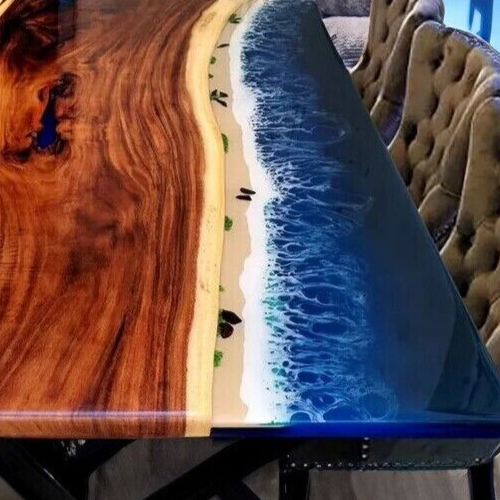 Transform your kitchen and dining space into a coastal haven with our stunning Ocean Walnut Epoxy Table. Meticulously handcrafted, this one-of-a-kind piece seamlessly blends the warmth of walnut wood with the ethereal beauty of ocean-inspired epoxy resin. Key Features: Natural Elegance: The table is crafted from high-quality walnut wood, showcasing its natural grains and warm tones. Each piece of wood is carefully selected for its unique character. Oceanic Resin Artistry: The tabletop features a captivating epoxy resin design that mimics the fluidity and movement of ocean waves. Swirls of blues, greens, and whites create a mesmerizing visual experience. Durable and Functional: The epoxy coating not only adds a stunning aesthetic but also provides a durable, heat-resistant, and easy-to-clean surface, making it ideal for daily use in your kitchen and dining area. Versatile Design: Whether you're hosting a dinner party or enjoying a family meal, this table seamlessly blends into various decor styles, from coastal and rustic to modern and contemporary. Custom Craftsmanship: Each table is handcrafted by skilled artisans, ensuring a level of craftsmanship and attention to detail that sets it apart from mass-produced furniture. Specifications: Dimensions:48"x30" Inches Materials: High-quality wood, epoxy resin Colors: Ocean Blue Finish: Glossy and durable Shipping and Packaging: * We can make the table top similar to this as it is handmade or natural process you will not get the same as shown in picture but you will get the similar one * The table top is made in Agra India & fully handmade. * The top will be delivered by FedEx or DHL free of cost door to door. * If there is any local tax, custom duties or Vat will be paid by the buyer at the destination. * The parcel is dispatch with proper packing & fully insured covering all kind of risk. Thanking You...
