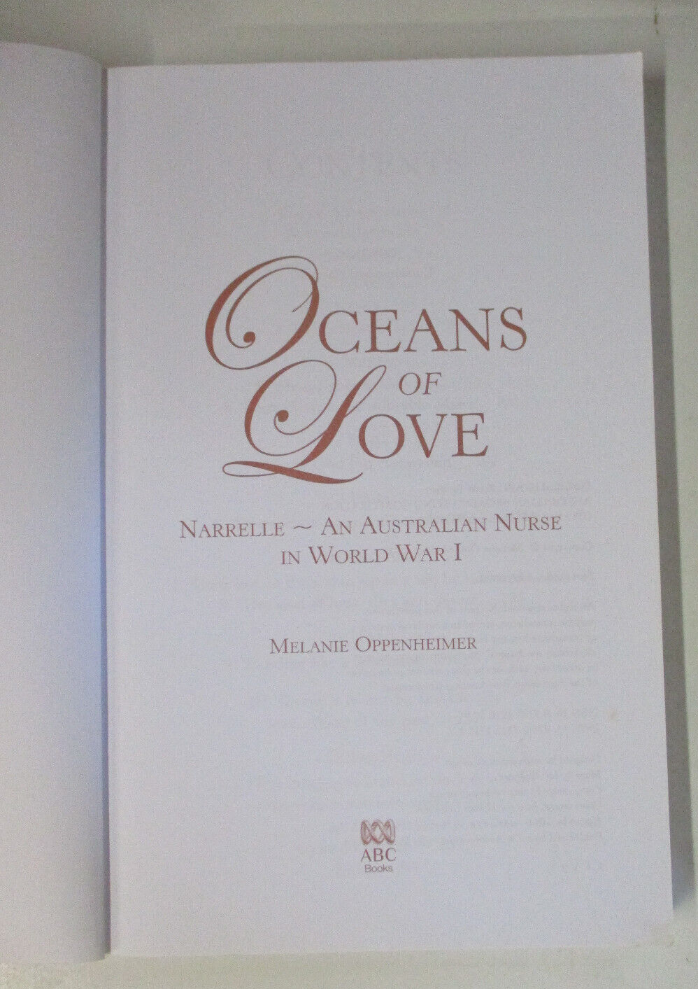 Oceans of Love by Melanie Oppenheimer This book is in good second hand condition. Moderate wearing to the cover, edgewear, crease in back cover. Name written inside. Published by ABC Books, 2006, 272 pages. Blurb: In her mid 30s, nursing sister Narrelle Hobbes left a comfortable life in Australia and travelled to London to join the Queen Alexandra's Imperial Military Nursing Service Reserve. ISBN 0733317103 Item weighs 411 grams. Buyer to pay postage where indicated . I will happily combine items. Please contact me prior to bidding if you have any queries.