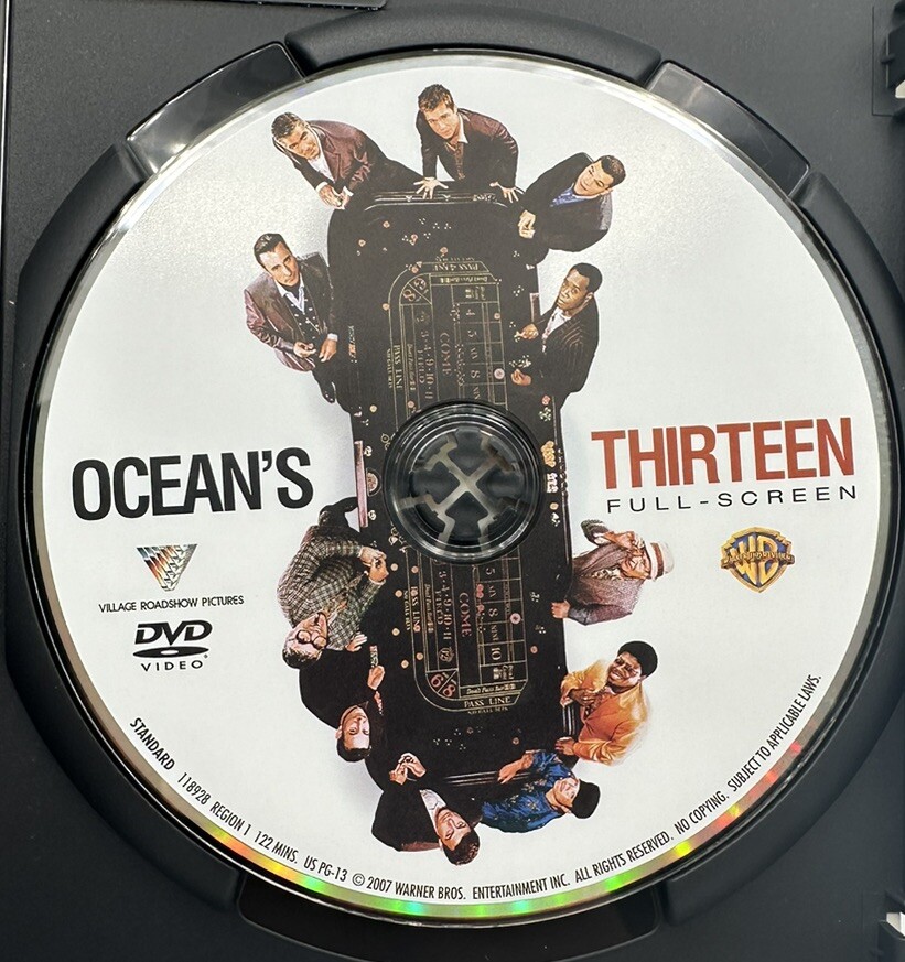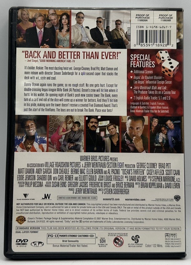 This DVD features the highly acclaimed 2007 heist film "Ocean's Thirteen," directed by Steven Soderbergh and starring George Clooney, Brad Pitt, and Al Pacino. The movie is presented in full screen edition and has a run time of 122 minutes. The DVD is compatible with region code 1 (US, Canada...) and comes with English language and subtitles. It falls under the categories of movies and TV, DVDs and Blu-ray discs. The film is rated PG-13 and is a comedy genre with sub-genres of conspiracy, mystery, and heist. The DVD is manufactured in the United States by Warner Home Video and is a standard feature.