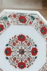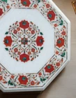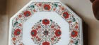 Product information Size: 24"X24" Inches Material: Marble & Semi Precious Stones Shape: Octagon Thickness: 20-30 mm Finished- Polished What is Inlay Art? One of the most attractive work of art that comes from marble is"Marble Inlay" work. It is the same work that adorns the Taj Mahal and other Mughal monuments. It is a closely protected traditional art and only a few expert exponents are available today. The delicate process involves cutting and engraving marble shapes manually. To start with, a predefined pattern e.g., floral design or geometrical design is engraved on the marble slab. Small pieces of marble of different shades are cut delicately to fit in these grooves precisely. These small pieces are then slipped in the grooves. Apart from marble, many other materials can also be used. History Of Inlay Art Inlay work on delicate precious stone began in the workshops of Florence in Italy around the end of the 16th century. This was known as PIETRA DURA.(Pietra= Stone, Dura= Hard) The Italians had created a classic artistic form and held a monopoly over it. From 1630 onward pietra dura appeared on movable, small objects as decorative panels, with bird and flower motifs, suitable for cabinet fronts and table tops. Some of these soon reached the Mughals in the form of presents. Of all the Mughal Emperors, Shah Jahan was the greatest patron of architecture in India. For him no amount of money or time was too much to create enduring, everlasting architectural beauty and through it be remembered always. It is in his buildings that one feels most compelled to make the connection between Mughal art and pietra dura. The Taj Mahal, the cenotaphs of the Emperor and his wife, the main floor and the surrounding marble railings bear very close resemblances to the pietra dura form. Process of Marble Inlay Art Master Craftsman carefully plans a design, which is etched lightly into the marble surface and later scored out with an iron chisel. Many of the tools of the trade are basically the same as those used by the Mughals hundreds of years ago. He then decides on the colour scheme depending on the requirements of piece being created. Semi-precious stones and gems are expertly chosen to give just the right graduation in colour and shade for the overall radiance of the pattern. They are shaped and polished by means of an emery wheel. Sometimes heat treatment is applied to certain stones to get a shading effect. The effort involved in making just one single flower can often take days of work, depending on the detail; it is not unusual to be designed from hundreds of different slices of stone. There are many varieties of coloured stone available for utilisation in marble inlay work: malachite, cornelian, jasper, mother of pearl, abalone shell, lapis lazuli, agnate, coral, turquoise and tiger eye to name just a few. The grooves are filled with their precisely corresponding shapes of coloured stone and secured in place with a white putty made from oil, and wax. Once the design is completely dry, the piece is polished with a mixture of sand, water and emery paper to give a shiny smooth finish. Shipping & Packaging For shipping we use DHL & FedEx Export packing sealed wooden, crate with foam plastic straps outside. If there is any Local Tax, Custom Duties or Vat at the destination, it will be paid by the buyer. Have a Nice Day