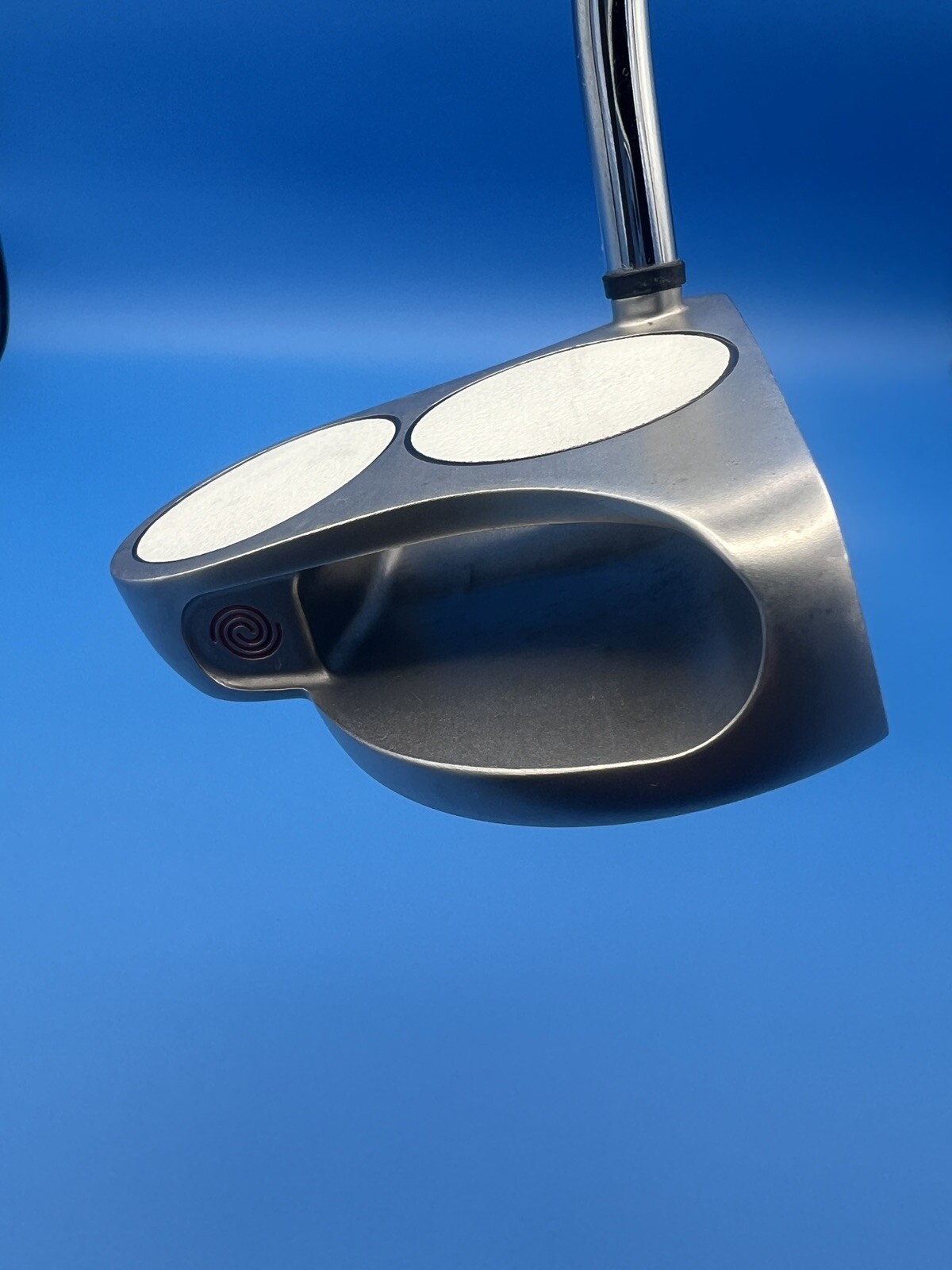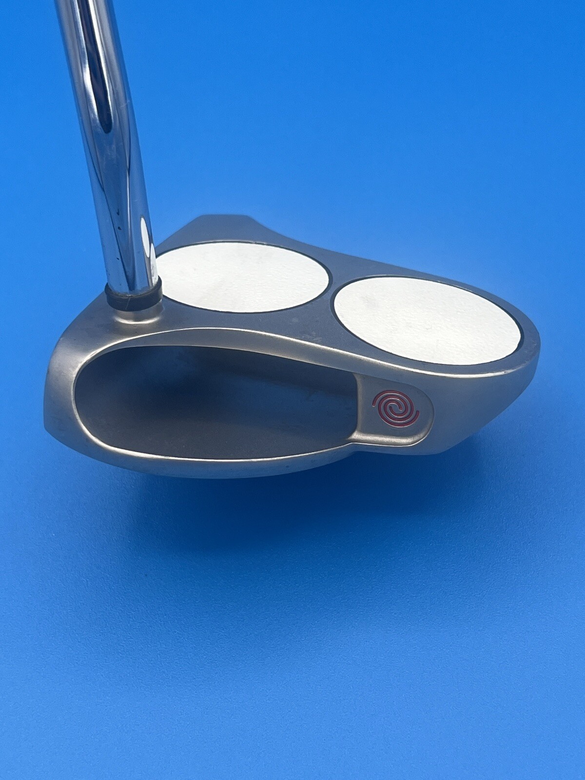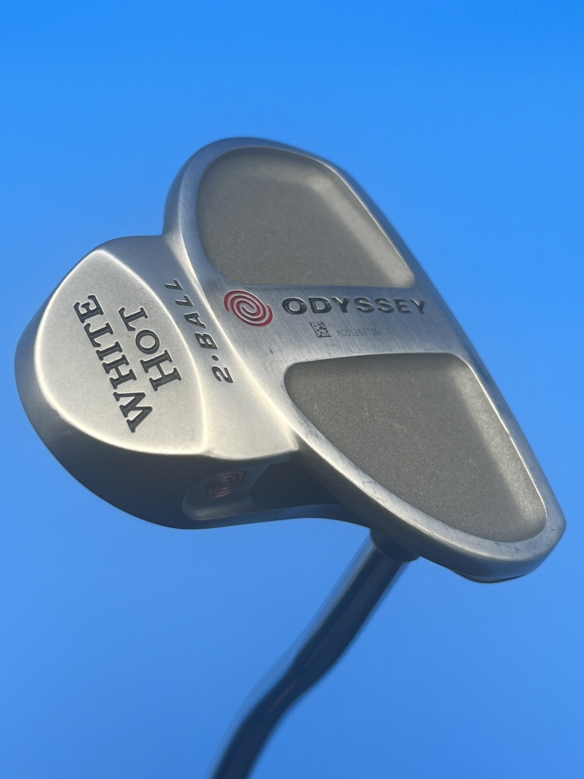 The Odyssey Golf White Hot 2 Ball Putter is a 35" Mallet style club designed for right-handed golfers. With a steel shaft and a lie angle. The sleek white color and Odyssey branding make it a stylish and reliable choice for one looking to improve their game. The 2-ball design helps players line up their strokes more effectively, making it a great addition to any golfer's equipment collection. Rare find with logo and no head cover!