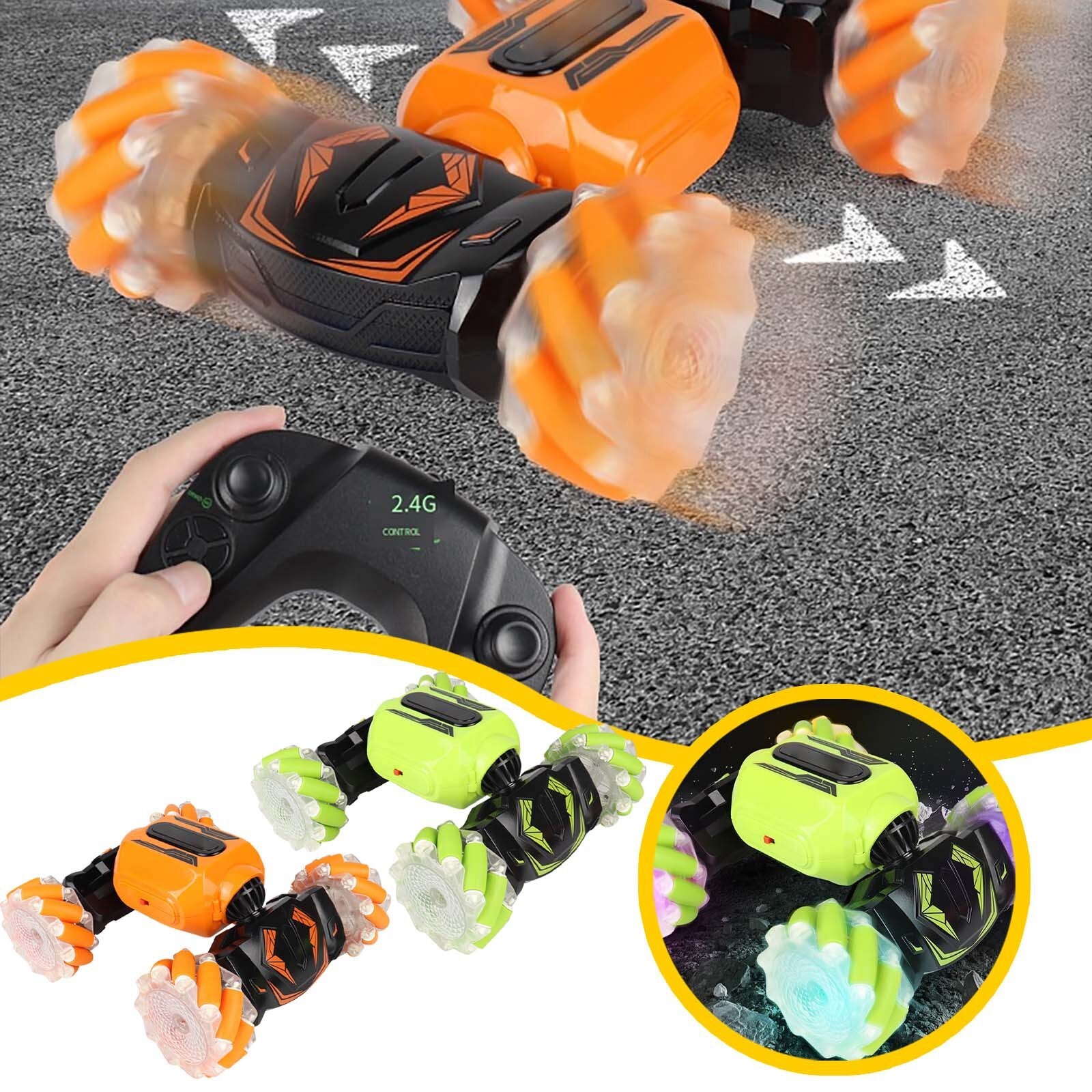All-Terrain Remote Control Stunt Off-Road Toy Car, 2 Control Modes RC Car Features: Remote control, stunning lights and sounds, the tiger whistle for an adventure with real car sounds. 2.4 radio system: -interference ability, can race on the same track at the same . 100 metres distance, race. TWO MODES OF CONTROL: One mode is to wear the watch on your hand and control the stunt car by changing gestures such as forward, backward, left/right turn, flip driving and high body change. The other is to use the remote control to make the car drive the way you want. ONE- TRANSFORMATION FOR ON-ROAD AND OFF-ROAD: The transformable body makes the vehicle more flexible and suitable for all terrains. Drive on grass, sand, rocks, rough roads and other terrains. LATERAL DRIVING DESIGN: This drift car features a special double-sided rolling style that allows for quick lateral movement or in place.The 4-wheel drive and transformable body system makes the vehicle more agile and delivers great power torque to drive on any with ease.The 4-wheel drive and transformable body system makes the vehicle more agile and delivers great power torque to drive on any with ease. Product Description: All-Terrain Remote Control Stunt Off-Road Toy Car, 2 Control Modes RC Car Material: ABS Color: as the picture shows, (Due to the difference between different monitors, the picture may have slight color difference. please make sure you do not mind before ordering, Thank you!) Package weight: 700g Package size: 22.5x16.5x6.5cm,(Please allow 1-3mm error due to manual measurement. please make sure you do not mind before ordering.)