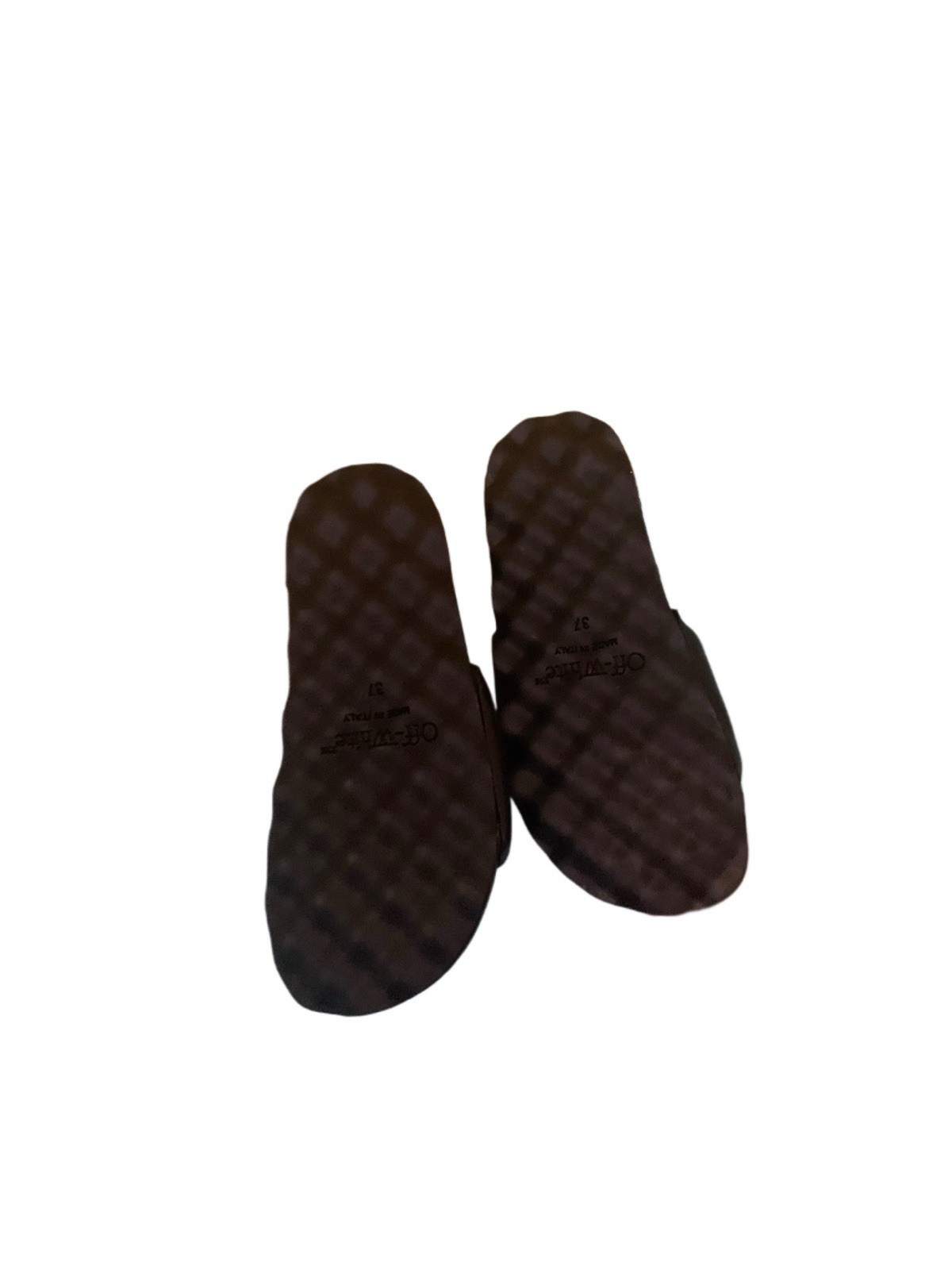 The Off-White HF POOL SLIDER Black Rubber Pool Slide Sandals in Women's Size 37 are sleek and stylish sandals perfect for casual occasions during the summer and spring seasons. Featuring a slip-on closure and a low heel height, these sandals offer comfort and ease of wear. The black color, leather lining, and synthetic upper material add a touch of luxury to these sandals. The logo accents and flat heel style give them a trendy and contemporary look, making them a chic addition to any wardrobe. Size 7 US Bottom of sandal measures 9 1/2 inches from heel to to e Strap across measure 7 inches Wide part of toe measures 3 1/2 inches across