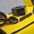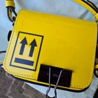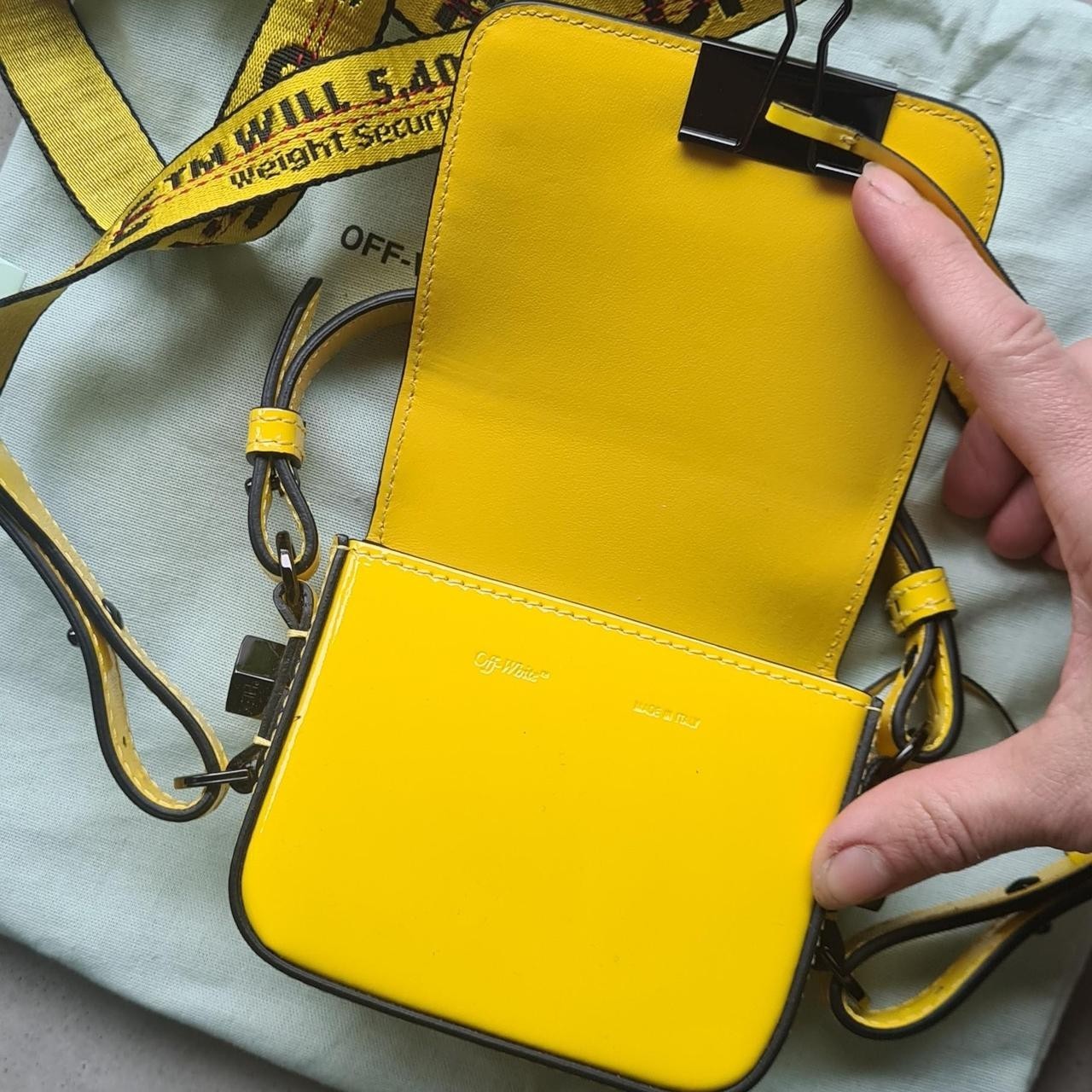 Virgil Abloh's iconic paperclip design in a cute mini bag. Bright yellow patent leather with burnished black edges and tonal stitching. detachable and adjustable carry handle with post-stud fastening at top. Detachable and adjustable logo webbing shoulder strap with post-stud fastening. Logo-engraved black hardware, logo plaque at the side. Belt loops and metal logo at the back. Foldover flap with magnetic fastening. Embossed logo and signature logo-engraved binder clip hardware on leather lanyard at interior. Logo printed in white inside and two card slots at interior. Textile lining in black. Can be used as a belt bag, but doesn't come with a belt. Dimensions (bag only, excl. hardware):Width: 11.5cmHeight: 10cmDepth: 5cm at the bottom, 4cm at the top Some pink marks on the front cover. Comes with original dustbag and paperwork, but no packaging or receipt.