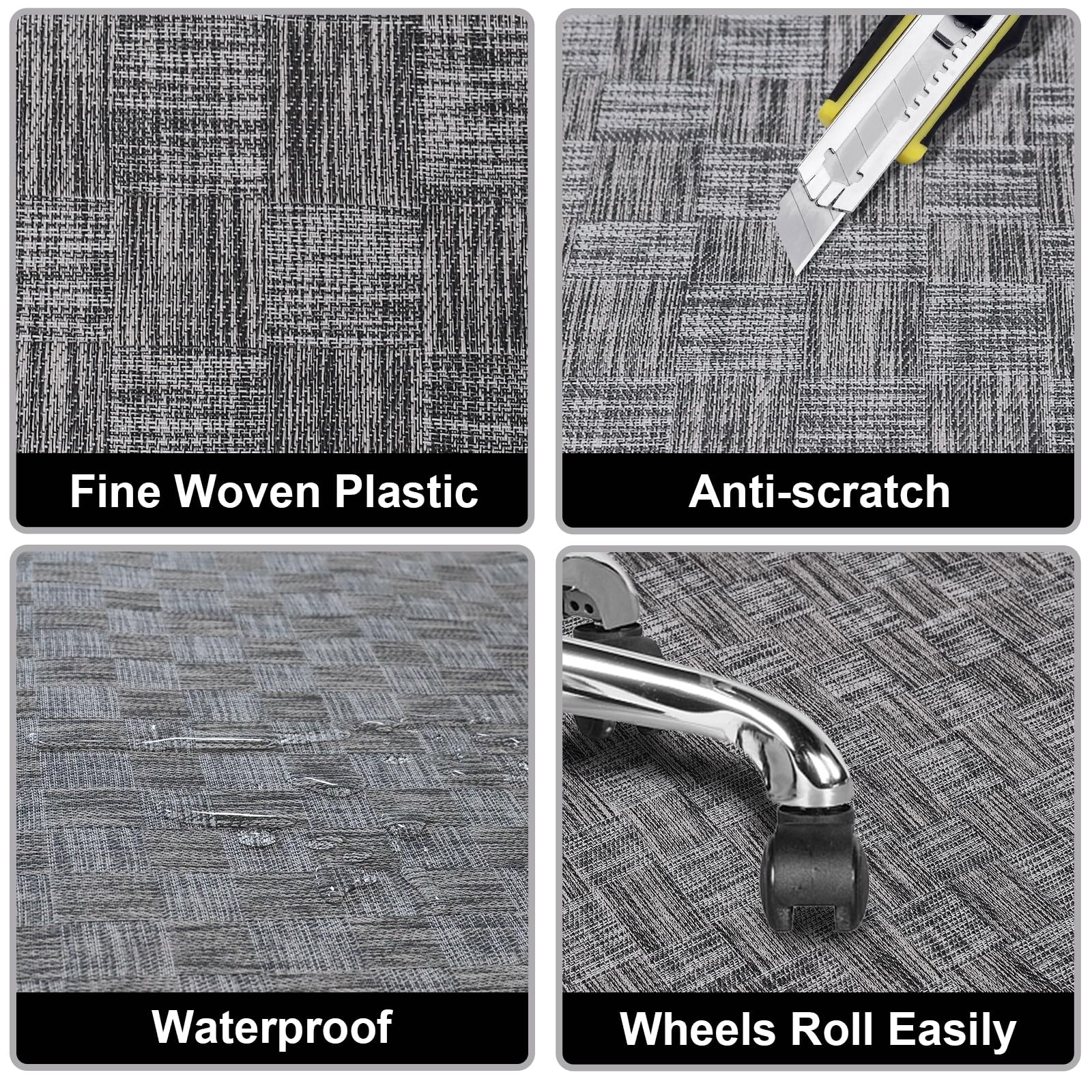Office Chair Mat: Our office floor mat is good for hardwood floors, tile, laminate, vinyl, concrete, and linoleum. It is ergonomically designed to allow effortless movement of office chair wheels, and provide good protection to your hard floor. Features: Designed for Hard Floors: Our chair mat are designed to protect the floor from scratches and wear caused by office chair. Not recommended for carpet, please search our carpet mat if you needDurable & Eco-Friendly Material: This desk chair mat is made from premium, odorless materials for durability and sustainability. Stain-resistant, easy to clean, and free from harmful chemicals, it’s safe for your workspace and the environmentNon-slip Bottom & Effortless Roll: The bottom of this floor mat for office chair has a non-slip design that keeps the mat from moving during use. The special pvc material on the surface allows your chair to glide smoothly on itUnique and exquisite design:The chair mat is designed with a unique rattan-like woven pattern, which perfectly match your home and work environment. And our office chair mats are made of high-quality PVC materials, so don't worry aboutaging and crackingWide Application: Works effectively as a floor mat for vinyl, stone, tile, wood, laminate, concrete and other hard surfaces. Whether in your offices, computer rooms, gaming rooms, bedrooms, and study, it provides reliable protection and enhancesfloor longevityTips: 1. For the purpose of saving packing space, our office Chair mats may be rolled when packaged. Rolling back, and the chair mat will be gradually flat over several hours. 2. Try placing it in a warm room or near a sunny window for best and quickest results. Specifications: 1. Material: polyethylene and rubber 2. Dimensions: (48 x 36 x 0.0935)" (L x W x H) 3. Weight: 5.6 pounds 4. Color: grey Package Includes: 1 x Office Desk Chair Mat Designed for Hard Floors: Our chair mat are designed to protect the floor from scratches and wear caused by office chair. Not recommended for carpet, please search our carpet mat if you need Durable & Eco-Friendly Material: This desk chair mat is made from premium, odorless materials for durability and sustainability. Stain-resistant, easy to clean, and free from harmful chemicals, it’s safe for your workspace and the environment Non-slip Bottom & Effortless Roll: The bottom of this floor mat for office chair has a non-slip design that keeps the mat from moving during use. The special pvc material on the surface allows your chair to glide smoothly on it Unique and exquisite design:The chair mat is designed with a unique rattan-like woven pattern, which perfectly match your home and work environment. And our office chair mats are made of high-quality PVC materials, so don't worry about aging and cracking Wide Application: Works effectively as a floor mat for vinyl, stone, tile, wood, laminate, concrete and other hard surfaces. Whether in your offices, computer rooms, gaming rooms, bedrooms, and study, it provides reliable protection and enhances floor longevity
