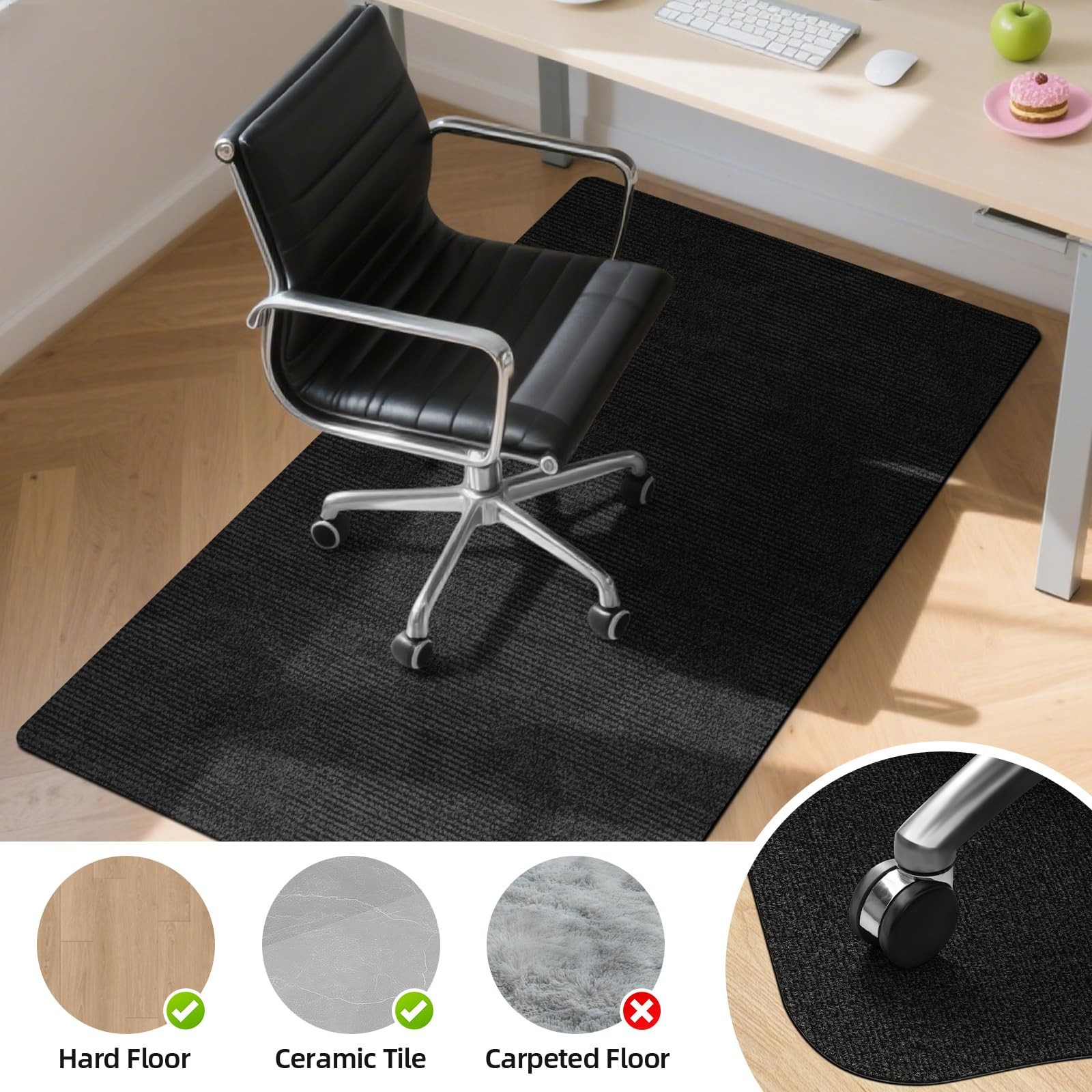 Office Chair Mat for Hardwood Floors 63" x 51", Durable Non-Slip Large Tile Floor Protector, Anti-Scratch Thick Heavy-Duty Recyclable Gliding Desk Mats for Computer Rolling Chairs, Slate Black ✅ Please note this chair mat is designed for hard floors, NOT suitable for carpeted surfaces. The size is 63 x 51 inches. Please REMOVE the transparent film on the back before use. You might notice some slight creases from folding – this helps us save resources and protect the environment by reducing packaging waste. To help remove them quickly, you could either: 1. Gently iron the mat on a low setting, or 2. Roll the mat up tightly and leave it like that overnight or for several hours. Thanks for understanding and helping us reduce waste! ✅ Heavy-Duty Office Chair Mat for Hardwood Floors - Durable polyester and TPR (Thermo-Plastic-Rubber) construction delivers anti-scratch hardwood floor protection, engineered to withstand rolling chairs and daily wear. Extra-large desk chair mat covers more area, making it the best chair mat for hardwood and tile floors in high-traffic home, Gym or office spaces ✅ Non-Slip Hardwood Floor Protector Mat with Reinforced Materials - Thermo-Plastic-Rubber TPR backing grips floors securely, effectively prevent chair wheels roll-up. Acts as a protective desk mat for hardwood floors, ensuring stability for computer chairs without damaging delicate floor surfaces ✅ Low Pile & Ergonomic Gliding Chair Mat - Slim design blends invisibly under desks while the low pile gliding surface reduces leg strain. Ergonomic chair mat compatible with hardwood floor desk setups, ideal for long workdays ✅ Recyclable Hardwood Floor Chair Mat for Rolling Chairs - Made with recyclable polyester and TPR, this desk mat resists odors and stains. Easy to clean with hand-wash, vacuum cleaner or brush, offering long-lasting hardwood floor protection ✅ Large, Anti-Scratch Mat for Office or Home - Durable TPR layer prevents dents and scuffs, while the proper color finish complements any decor. A hardwood floor protector mat trusted for heavy-duty performance and ergonomic comfort