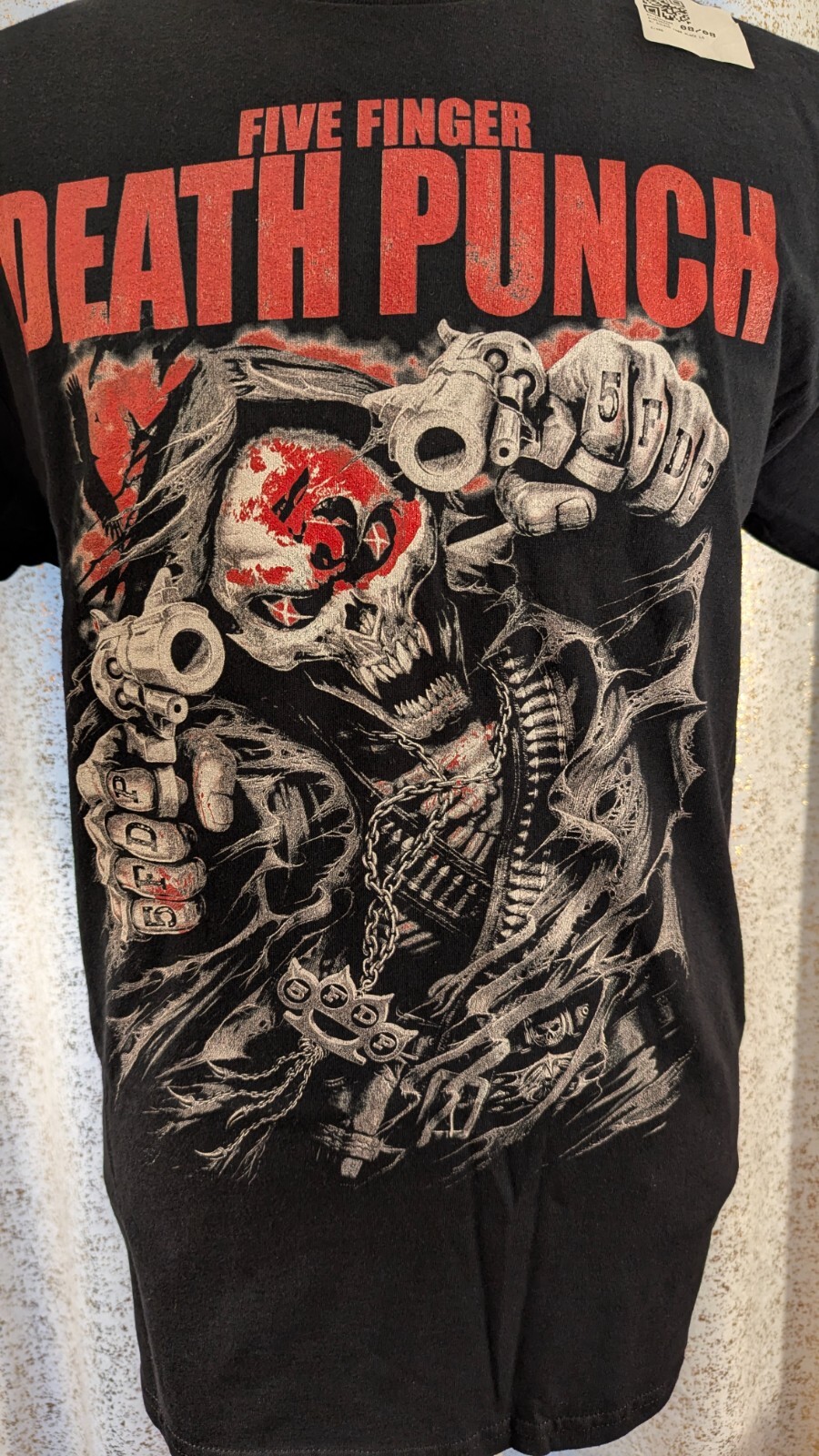 The Five Finger Death Punch Both Barrels Jumbo Print T-Shirt is an officially licensed piece of clothing featuring the iconic band logo. Made of cotton with a crew neck and short sleeves, this black shirt is machine washable and designed for regular fit. It is part of the Gildan Heavy Cotton product line, perfect for both men and women. With a theme centered around the band, this t-shirt is suitable for all seasons and is a must-have for any fan of Five Finger Death Punch.