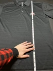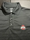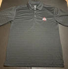 This shirt is a men’s medium black polo shirt. It features an embroidered Ohio State logo. The shirt has stripes knit into the fabric. This shirt is in good condition. This is a very lightweight polo shirt. It would be perfect to wear to cheer on the Buckeyes! Please view all photos.