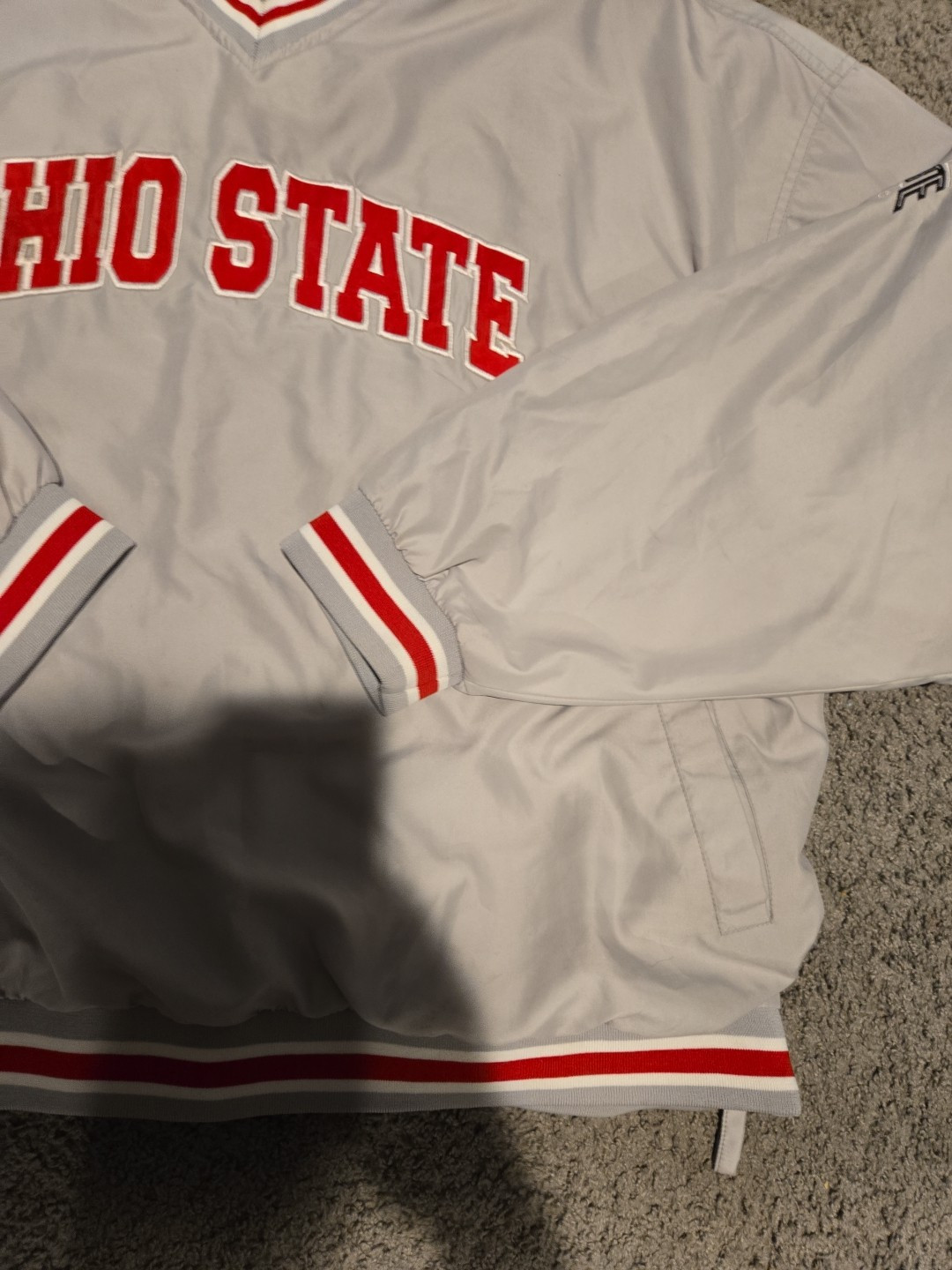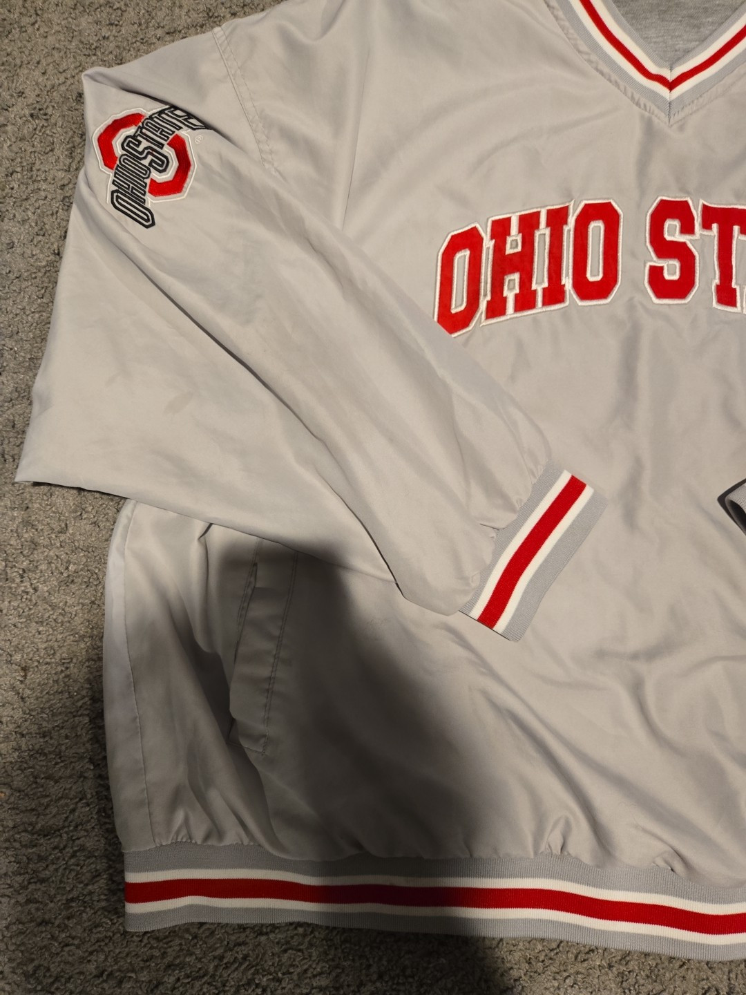 This Ohio State Buckeyes jacket is a men's 2XL gray windbreaker made by Team Athletics. It is officially licensed by the NCAA and perfect for wearing during the regular football season. The jacket features the Ohio State Buckeyes team logo and is a great addition to any fan's collection.