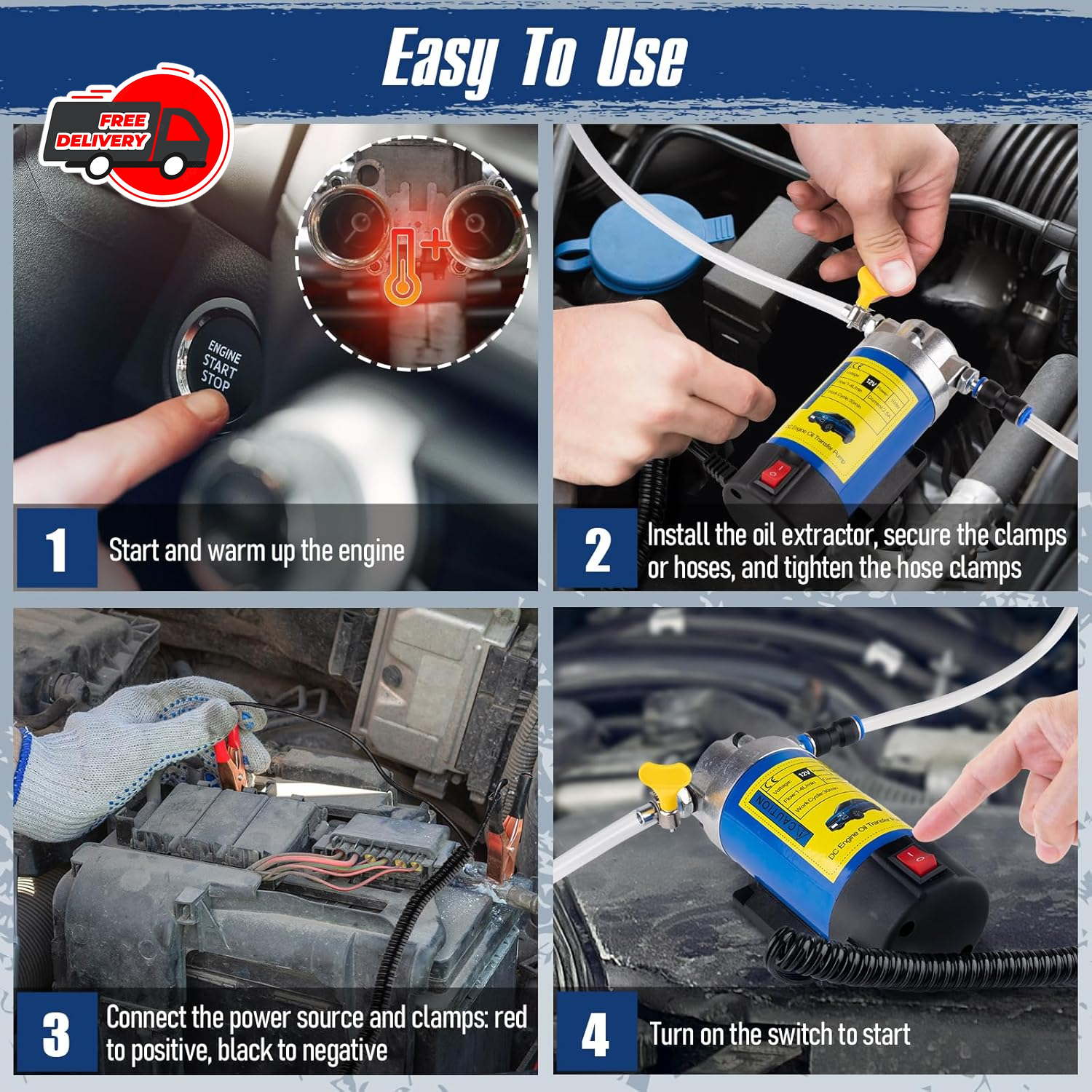 HEAVY-DUTY DESIGN: The upgraded 100W pure copper motor delivers fast and efficient oil extraction, our oil pump extractor is corrosion-resistant, wear-resistant, and designed for long-lasting performance. It’s a great choice for frequent oil changes MULTI-FUNCTIONAL OIL PUMP: The unique oil extractor pump for oil change is suitable for motorcycles, trucks, tractors, marine engines, lawn mowers, pressure washers, snow blowers and other outdoor power equipment. It can extract engine oil, transmission fluid, coolant, and diesel COMPLETE ACCESSORIES: Our fluid extractor pump kit includes 1 oil transfer pump, 1 outlet hose (10mm), 2 inlet hoses (6mm, 8mm), and 3 adapters. Safety features like overheating protection and leak prevention ensure a clean and efficient oil change process USER-RIENDLY OPERATION: This electric oil extractor pump is easy to store and transport, with simple installation. Just preheat, attach the hoses, connect the battery clamps, and you're ready to start extracting. The transparent hoses allow you to monitor the fluid flow in real-time PRECAUTIONS: Control the flow rate by adjusting the voltage. Before extracting viscous oil, preheat the engine oil pump to 40°C - 60°C (104°F - 140°F). Do not operate the transmission fluid pump continuously for more than 15 minutes; allow it to cool for 10 minutes between operations to prevent overheating. Regularly check the hoses and connectors for blockages or damage, as clogs can limit the flow rate and cause overheating