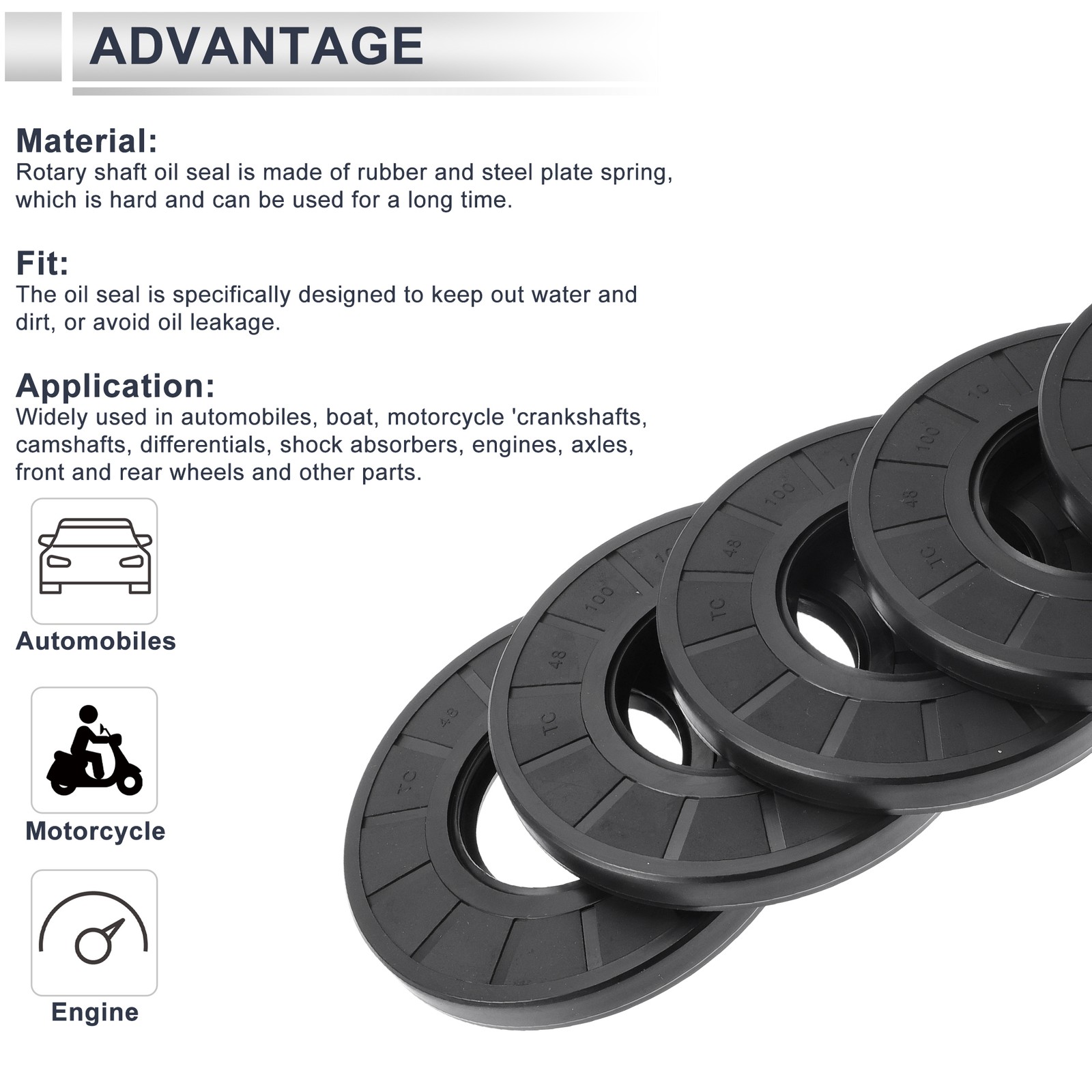 Document Features:The oil seal is specifically designed to keep out water and dirt or avoid oil leakage. Prevent dust into inside of the machine, and prevent lubricating oil from leaking.Rotary shaft oil seal is made of Nitrile Rubber and and steel plate spring which is water and oil resistance, heat resistant, good sealing, wear resistant, anti static. Durable and can be used for a long time.Widely used in automobiles, boat, motorcycle 'crankshafts, camshafts, differentials, shock absorbers, engines, axles, front and rear wheels and other parts.It is widely used in automotive sealing products, but it is not suitable for phosphate series hydraulic oils and gear oils with extreme additives.Specifications:Type:TC Double Lip w Steel SpringMaterial:Nitrile RubberInner Diameter:48mmOuter Diameter:100mmWidth:10mmInstallation:1. Clean the mounting surface, ensure that the mounting surface is clean; 2. Use the appropriate amount of lubricant, avoid too much or too little;3. Ensure that the installation of the oil seal is oriented correctly, with the lips facing the rotating shaft; 4. Avoid over-tightening during installation to avoid damaging the oil seal.Package includes:5 TC Double Lip w Steel Spring Oil SealNote:Please check the dimension of the product for consistency before purchasing.Regularly check the sealing effect of oil seals and replace damaged oil seals in time. Shop Category New Arrival Hot Item Oil Seal Seal Ring Rotary Shaft Seal Nitrile Rubber 48x100x10mm Black 5 Pcs Features: The oil seal is specifically designed to keep out water and dirt or avoid oil leakage. Prevent dust into inside of the machine, and prevent lubricating oil from leaking. Rotary shaft oil seal is made of Nitrile Rubber and and steel plate spring which is water and oil resistance, heat resistant, good sealing, wear resistant, anti static. Durable and can be used for a long time. Widely used in automobiles, boat, motorcycle 'crankshafts, camshafts, differentials, shock absorbers, engines, axles, front and rear wheels and other parts. It is widely used in automotive sealing products, but it is not suitable for phosphate series hydraulic oils and gear oils with extreme additives. Specifications: Type:TC Double Lip w Steel Spring Material:Nitrile Rubber Inner Diameter:48mm Outer Diameter:100mm Width:10mm Installation: 1. Clean the mounting surface, ensure that the mounting surface is clean; 2. Use the appropriate amount of lubricant, avoid too much or too little; 3. Ensure that the installation of the oil seal is oriented correctly, with the lips facing the rotating shaft; 4. Avoid over-tightening during installation to avoid damaging the oil seal. Package includes: 5 TC Double Lip w Steel Spring Oil Seal Note: Please check the dimension of the product for consistency before purchasing.Regularly check the sealing effect of oil seals and replace damaged oil seals in time. Item Specifics Brand X AUTOHAUX Material Nitrile Rubber Type TC Double Lip w Steel Spring Oil Seal Manufacturer Part Number Does Not Apply Product Name TC Double Lip w Steel Spring Oil Seal Net Weight 358g Shell Color Black Interchange Part Number Does Not Apply Other Part Number Does Not Apply Dimension 48x100x10mm Package Content 5 Pcs Oil Seal Note This is not oem product,accessory only. MPN Does Not Apply upc 678202515747 You Should Know If you have any questions, please feel free to contact our customer service. Our response will be faster than eBay! Our Handling Time: within 24 hours on weekdays eBay Handling Time: 72 hours About Us Shipping Feedback Payment Contact Us Angstrom Autohaus is based in Hong Kong, our group comprises factories in Asia that manufacture OEM and aftermarket automotive parts and accessories. We believe in FACTORY DIRECT purchases. Our mission is to deliver Lower Prices and Better Quality to consumers and distributors wherever, whenever. We operate from a distribution center in Hong Kong, where we perform sourcing, quality control and fulfillment. We strive to ensure that our products are reliable, updated and that our transactions are smooth and speedy. We are positioned to bring you the latest consumer automotive aftermarket parts and accessories globally and round the clock. We are proud to have served over 500,000 ebay buyers worldwide. International Buyers - Please Note: Import duties, taxes and charges are not included in the item price or shipping charges. Buyers are responsible for these charges. Please check with your country's customs office to determine what these additional costs will be prior to bidding/buying. Note that delivery times may vary, particularly during peak periods or inclimate weather conditions. All items will be dispatched from our warehouse in China or Hong Kong directly. Due to Custom restrictions, we do not ship lighters to US We cannot ship on weekends and we do not offer Saturday, Sunday or holiday delivery. All our items will be shipped to buyer's PayPal address, please confirm your address on PayPal before you bid. We left positive feedback for you after receiving payment. Your feedback is very important for us, positive feedback and 5 Score DSR is highly appreciated. Please let us know before leaving any negative feedback or 1 point, 2 point low DSR or open any disputes on Paypal and Ebay, please give us the opportunity to resolve any problems and we will try our best to satisfy your needs. If any question, please feel free to contact us via 'Ask seller a question' ,We try our best to reply to your emails as soon as possible, due to high volume of daily incoming emails and time zone difference, we may not be able to reply your emails immediately.Please allow 1-2 business days for us to response. Payment Methods: We accept eBay payment. We appreciate prompt payment and look forward to your business in the future. Unpaid item will be filed without receiving payment in 7 days from listing ended. Contact Us Please email us to resolve any problem before you leave any feedback to us. W