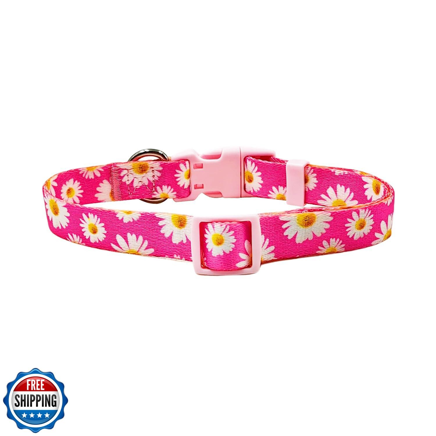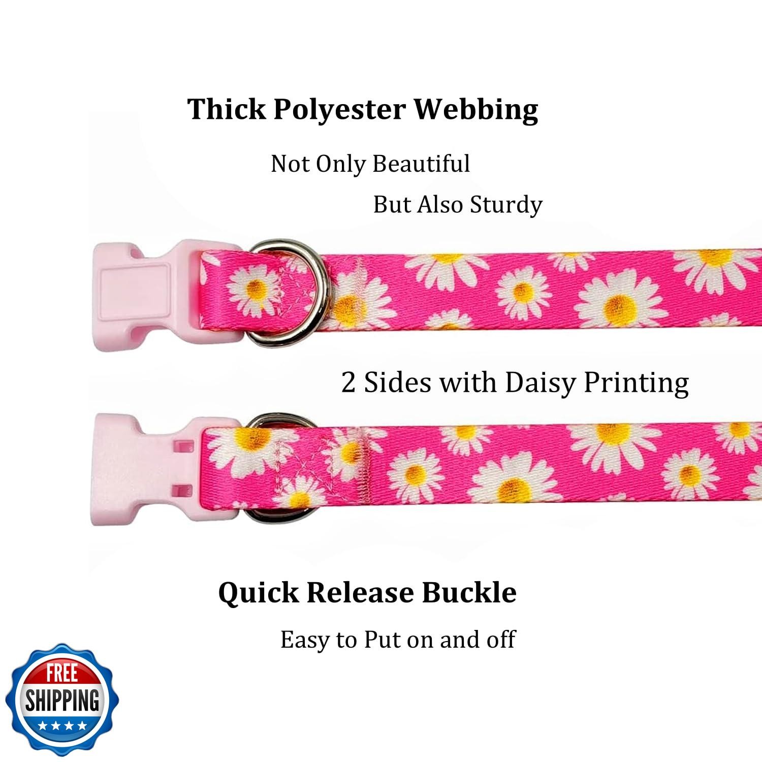 This collar is absolutely adorable with its vibrant hot pink daisy printâmy pup gets compliments everywhere! The soft yet sturdy polyester feels comfortable, and the adjustable buckle makes it easy to fit snugly. The metal D-ring is solid, perfect for attaching tags. Washing is a breeze, and it dries quickly. Great quality for the priceâhighly recommend for small dogs!