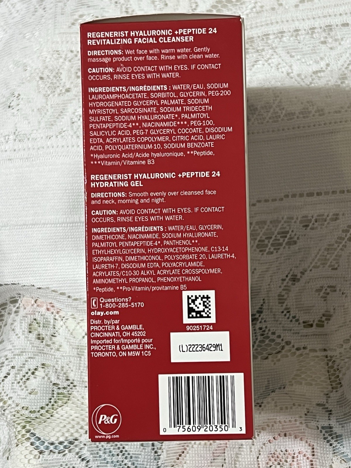 The Olay Regenerist Hyalauronic + Peptide 24 Cleanser is a revitalizing facial cleanser that contains hyaluronic acid to provide hydration and moisture. The set includes a 5 oz bottle of the cleanser along with a 1.7 oz bottle of Olay Regenerist Micro-Sculpting Cream Hydrating Gel. This product line is designed to improve skin elasticity and reduce the appearance of fine lines and wrinkles, making it an effective anti-aging skincare solution for those looking to achieve a smoother and more youthful facial complexion.