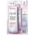 Olay Super Serum Body Wash, 18.5 fl. oz., 2 pk. Highlights Contains (2) 18.5 fl. oz. of Olay Super Serum Bodywash Formulated with Niacinamide, BHA, Collagen Peptide, vitamin C, vitamin E Transform Skin: Visibly firm, brighten, and even your skin LONG-LASTING: Lock in hydration for 24 hours with continued use Dermatologist-tested and free of phthalates and silicones Advanced Skin-Delivery Technology Feel the difference Olay Super Serum Body Wash can make for your skin. See and feel the difference of 5+ ingredients as they work to brighten, even, and firm skin for an ultra-luminous look. Hydrate your skin for 24 hours and experience how skin care ingredients, moisturizers, and our advanced skin-delivery technology can noticeably improve skin. Stock up and make less trips with this Olay Super Serum Body Wash 2-pack. 5 Powerful Ingredients This body wash for women is formulated with Olay Super Serum technology: Niacinamide, BHA, Collagen Peptide, Vitamin C, and Vitamin E. It is dermatologist-tested and free of phthalates and silicones. Directions: Simply lather with a puff and rinse.