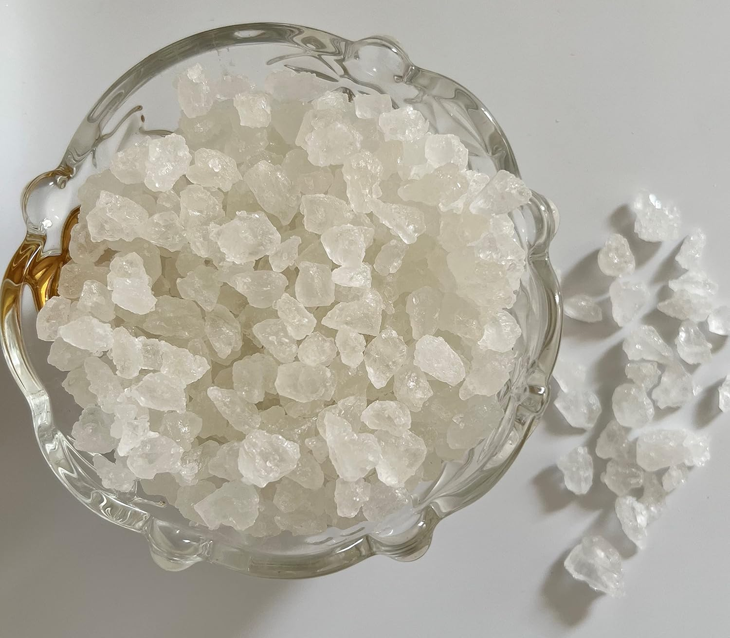 The purest sweetener for hot drinks like tea and coffee No color, no preservative and no flavor added Ingredient: Cane Sugar Rock candy crystal (rock sugar) is made by a crystallization process as diamond produces in nature, just with different ingredients. This process breaks apart sugar's molecular crystal lattice. After removing all impurities, in a high temperature and a specific time, the process allows producing larger and purer crystal of sugar that is known as classic rock candy crystals. This product is processed on a facility that also processes rock candy strings. May contain small pieces of string.