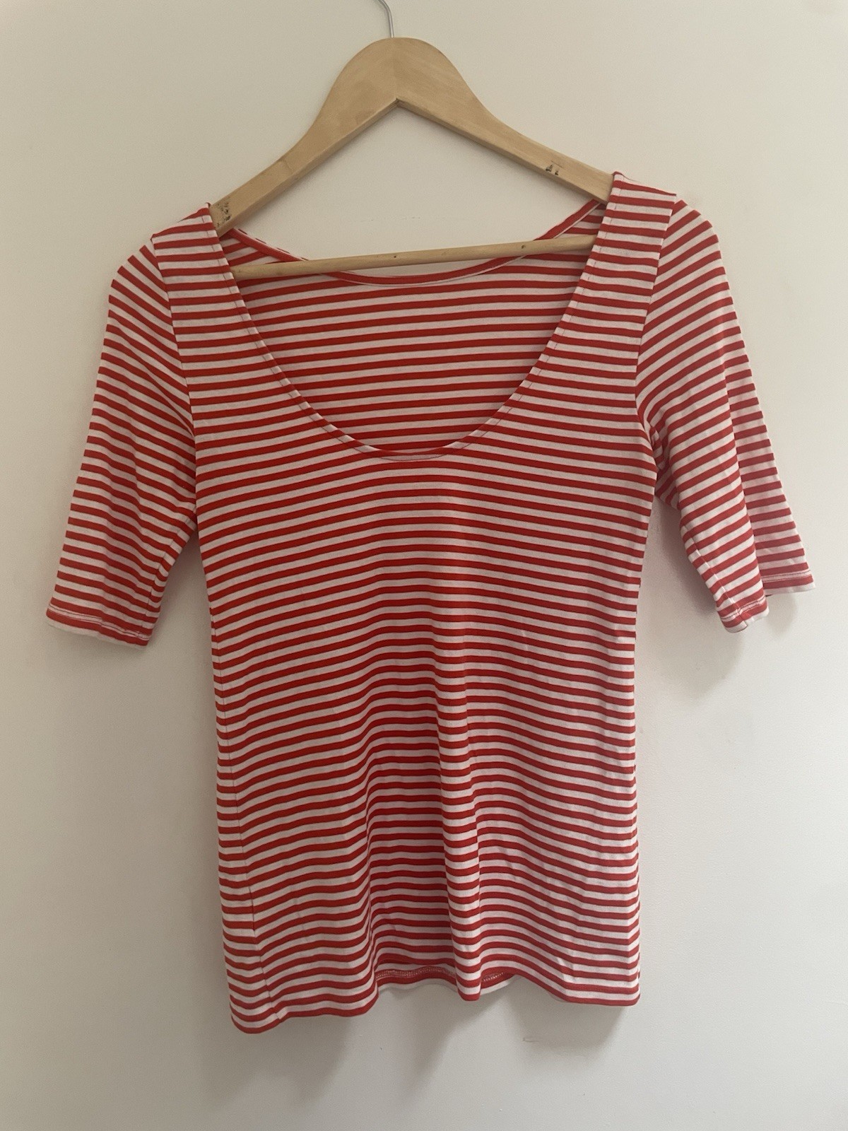 Old Navy Fitted Women's Striped Cotton Scoop Back Short Sleeve Shirt Red White S. Condition is pre-owned. Smoke free, pet free home. Shipped via USPS Ground Advantage. In very good condition. Free of rips or stains.