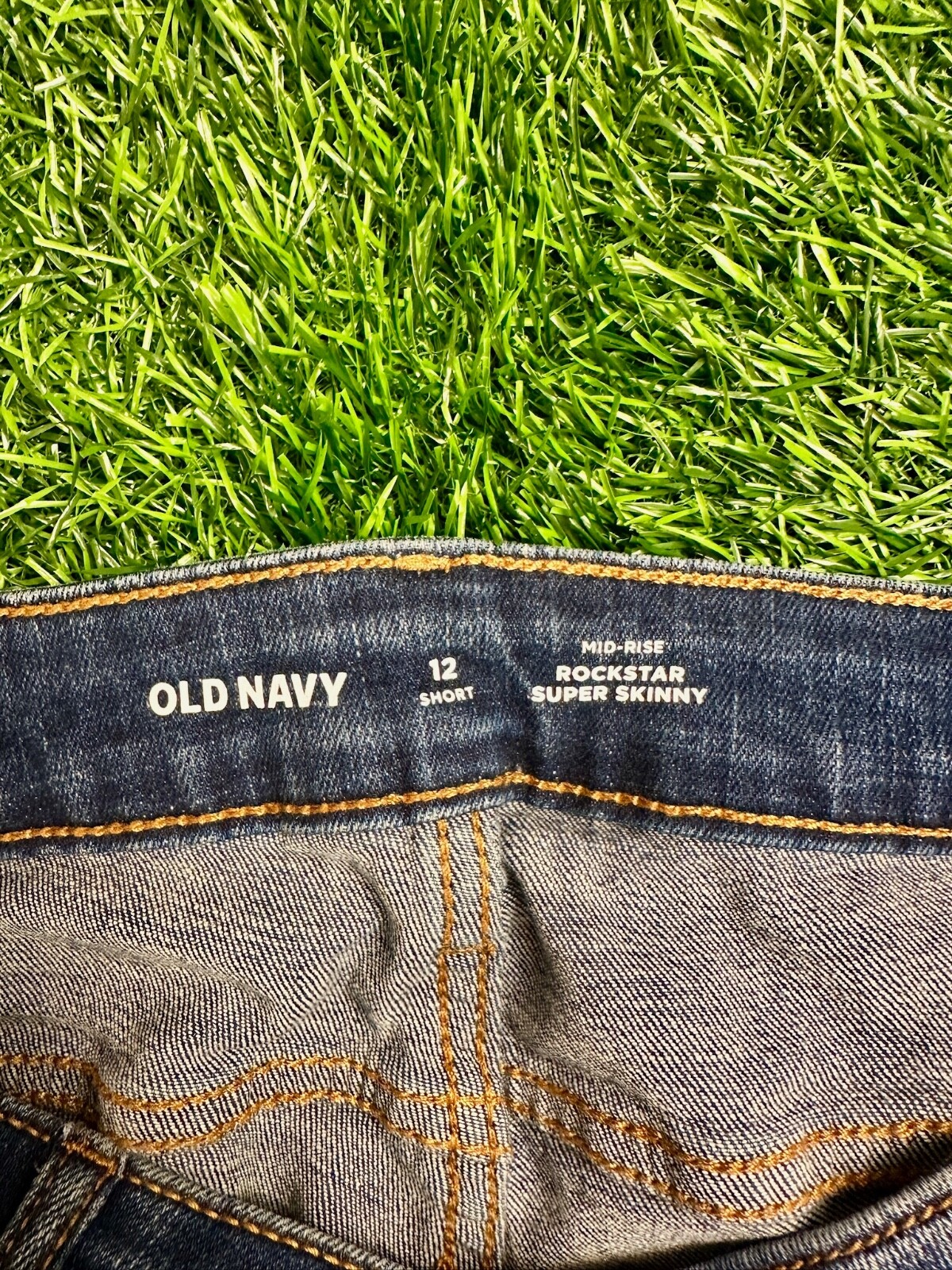 These Old Navy Rockstar Super Skinny Mid-Rise Dark Wash Jeans in size 12 feature a solid denim fabric with a dark wash. They have a zip and button closure, a 5-pocket design, and a slimming, stretch fit. Made of a blend of polyester, spandex, and cotton, they are machine washable. The jeans have a 33-inch waist size, a 28-inch inseam, and a mid-rise of 8.5-10.5 inches. Perfect for a rock, school, college, or city-themed look.