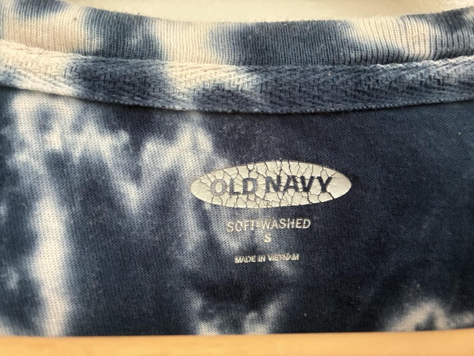 Old Navy Soft-Washed Men's Logo Spiral Tie-Dye Short Sleeve Shirt Americana S. Condition is pre-owned. Smoke free, pet free home. Shipped via USPS Ground Advantage. In good condition. There is a light stain on the front of the sleeve. Free of rips.