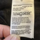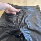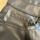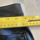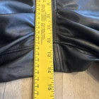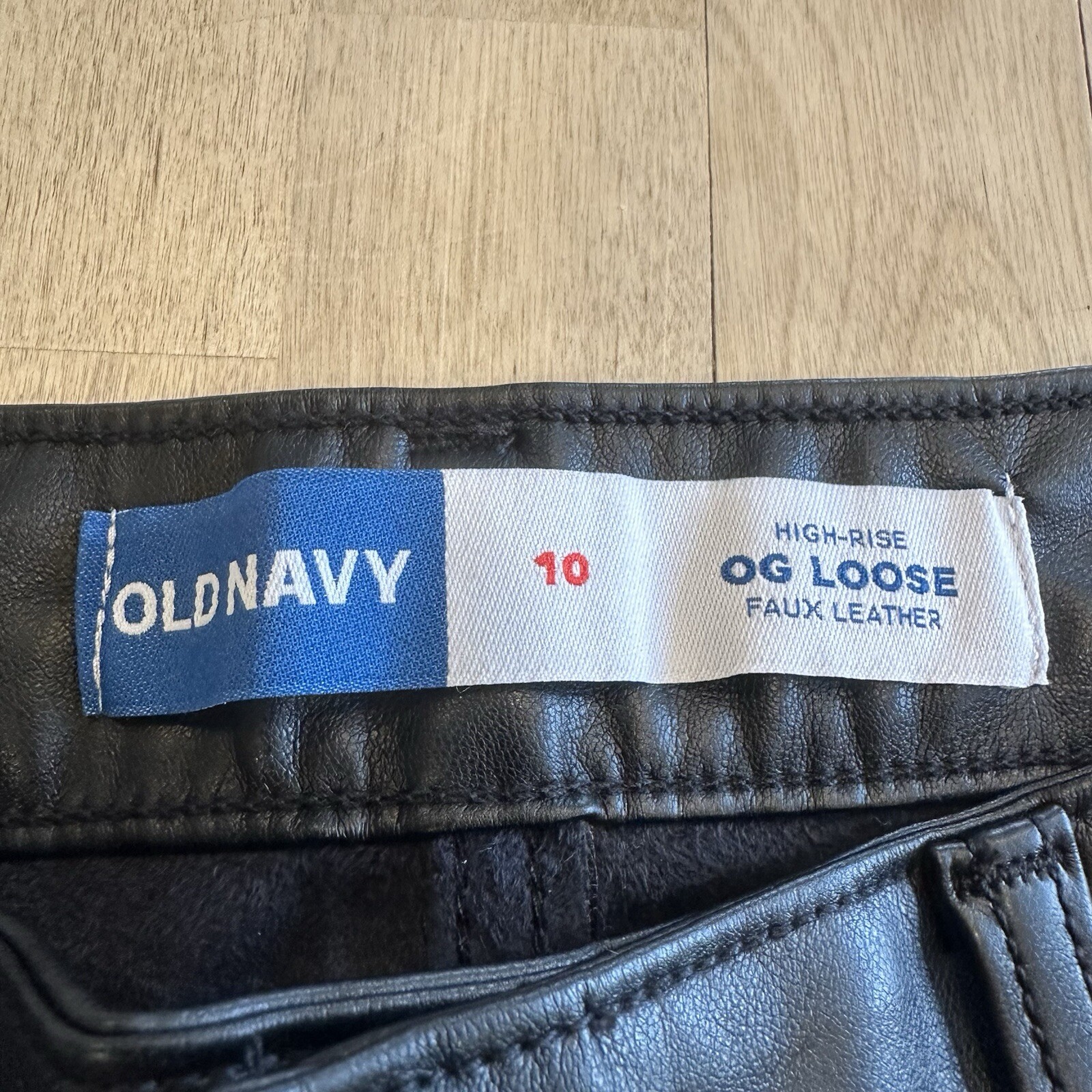 These are Old Navy High Rise OG Loose Faux Leather Pants in black, size 10 for women. They feature a solid pattern with a zip and button closure. Made of faux leather, the pants have a relaxed fit with a high rise and straight leg style. The design is inspired by punk and various music themes, making them a stylish choice for those with a rebellious and edgy fashion sense.