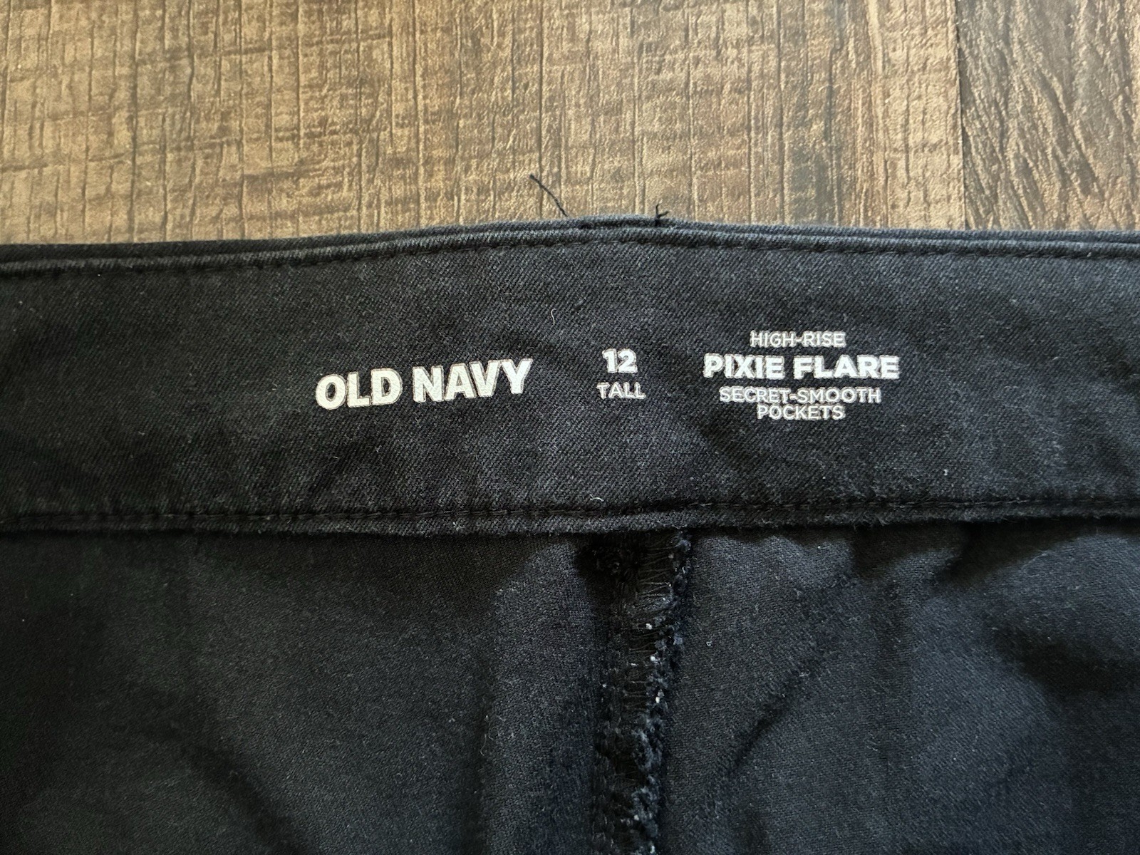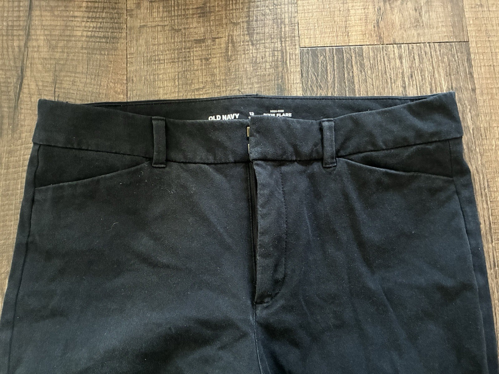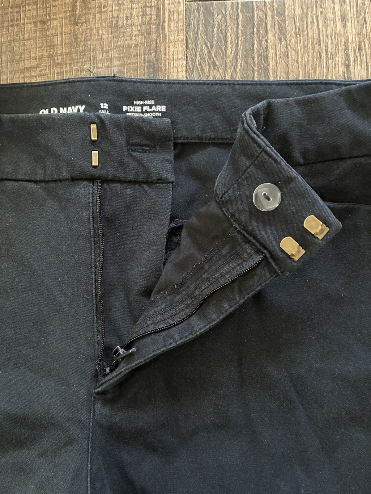 Old Navy Women's Solid Black High-Rise Pixie Flare Cotton Blend Pants 12 Tall. Condition is pre-owned. Smoke free, pet free home. Shipped via USPS Ground Advantage. In fair condition. The zipper came off the track. Free of rips or stains.