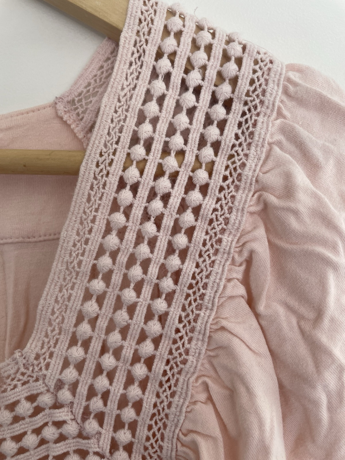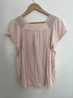 Old Navy Women's Solid Pink Lace Neckline Rayon Square Neck Short Sleeve Shirt L. Condition is pre-owned. Smoke free, pet free home. Shipped via USPS Ground Advantage. In fair condition. There are white spots on the front. Free of rips.