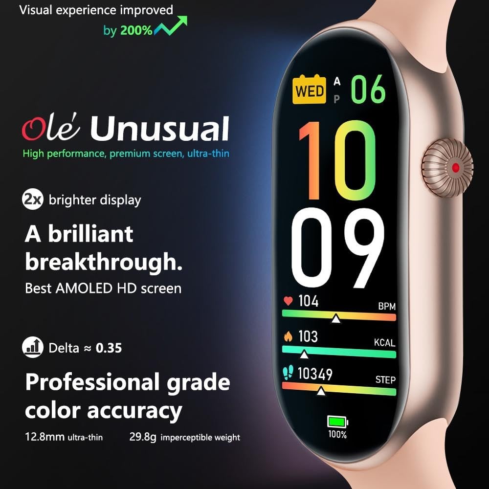 1.6" AMOLED HD Display: Step up your fitness game with the upgraded Ole fitness tracker, boasting a brilliant 1.6-inch AMOLED color HD screen. Enjoy sharp, vibrant visuals and a sleek metal body for a fashionable and lightweight look. Heart Rate & Blood Pressure Monitoring: Monitor your heart rate and blood pressure trends 24/7 with the tracker. Get valuable insights to aid your exercise planning and promote a healthy lifestyle. (Not intended for medical use) Blood Oxygen & Sleep Tracking: Ole fitness tracker can measure your blood oxygen saturation and help you understand your physical state. Great for high-intensity workouts and sports like marathons and gym workouts. Better sleep can power your days. Track your time in light and deep sleep to better understand your sleep quality each night. All-Day Activity Tracking: Automatically log your steps, distance, and calories burned throughout the day to keep track of your activity levels. With over 100+ sport modes, you can track virtually any type of exercise, from running and cycling to yoga and dancing. Manual Time and Date Setting: Enjoy the convenience of setting the time and date directly on your tracker, allowing for independent use without needing an app or smartphone. (Some functionality is limited in this case) Smart Features: Ole fitness watch offers a variety of intelligent functions. Customize your watch face, receive call and message notifications, find your phone, check the weather, get drinking and sedentary reminders, set alarms, control your music, and track your menstrual cycle. Compatibility: The Ole Fitness Tracker works with Android 5.0 & iOS 10 or newer smartphones with Bluetooth 4.0, but is not compatible with PCs, iPads, or Tablets. Enjoy up to 7-10 days of battery life on a single charge, depending on usage and other factors.