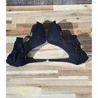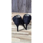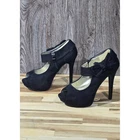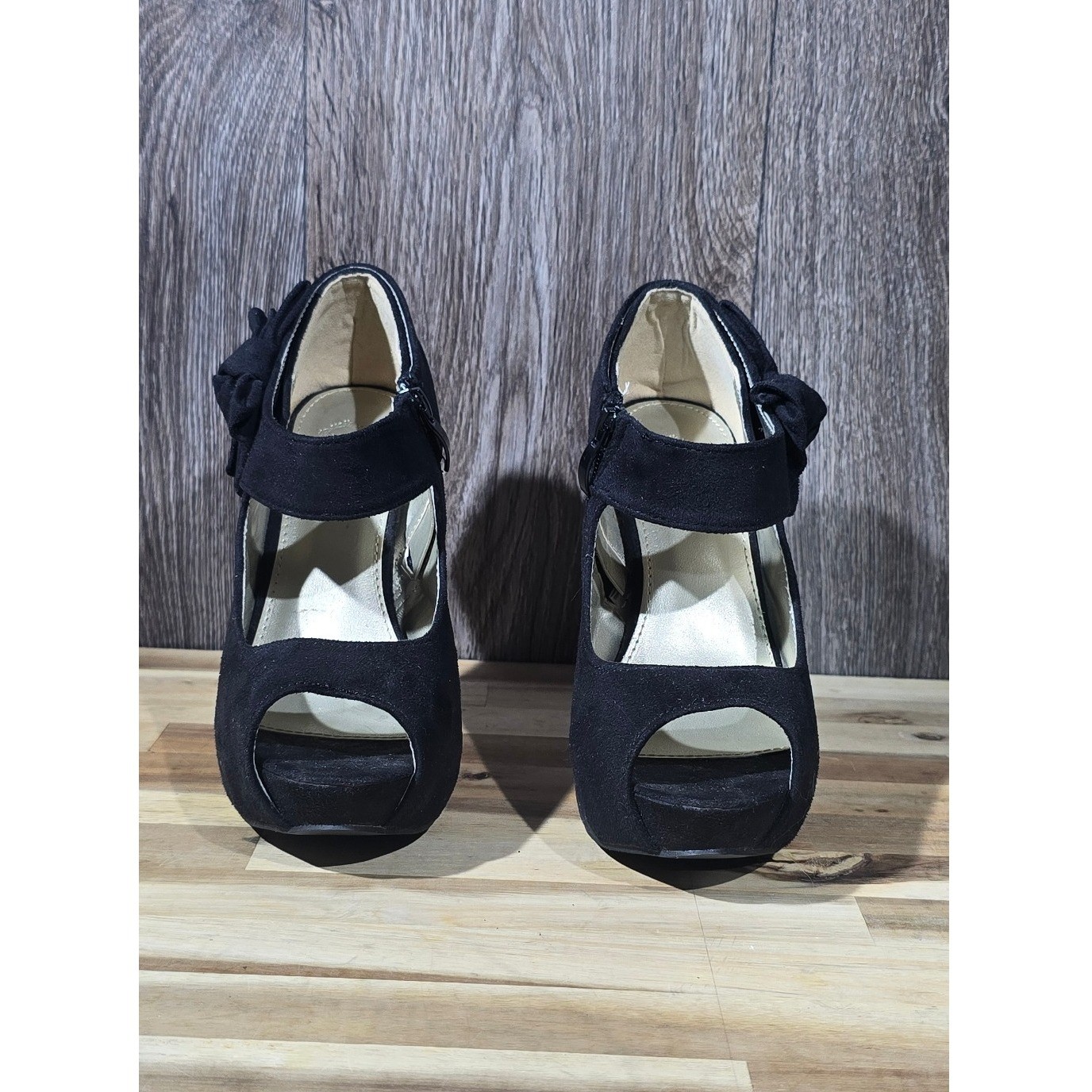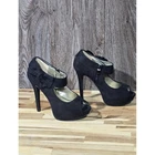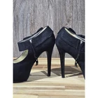 Elegant platform heels in a classic black hue, designed by Olho since 2000. These eye-catching heels feature a peep-toe design, a comfortable platform sole, and a stylish bow accent adorning the ankle strap. The ankle strap fastens with a functional side zipper. The heels offer a sleek silhouette and a touch of sophistication. Measurements: • Heel height: Approximately 4 inches Color: Black Style: Platform Department: Women Upper Material: Faux Suede Type: Heel Heel Style: Stiletto Toe Shape: Peep Toe Heel Height: High 5in Pattern: Solid Closure: Zip Features: Platform, Ankle Strap, Bow Accent, Side Zipper Model: Olho Platform Bow Heels Keywords: Olho , black heels, peep toe heels, platform heels, ankle strap heels, bow heels, womens heels, dress heels, party heels, size 7 heels, black platform heels, formal heels, heels with bow