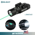 Olight Odin mini Tactical Weaponlight Flashlight 1250 Lumen 240 Meter Mlok Mount 139.95 USD Free shipping Olight Odin 2000 Lumens Picatinny Tactical Flashlight Rail Mounted Rechargeable 159.95 USD Free shipping Olight PL-Mini 2 Valkyrie 600 Lumen Rechargeable Weaponlight Tactical Flashlight 79.99 USD Free shipping Olight Baldr S Rail Mount 800 Lumens Weaponlight Tactical Flashlight Green Laser 129.95 USD Free shipping *The BALDR Pro R ships in lockout mode. Before first use, please press and hold both switches at the same time for about 2 seconds until it accesses the high white light or GL beam, indicating that it has exited lockout mode. FAQ Q1: Does it come with a remote pressure switch? A1: No, it does not come with the switch. You can find the RPL-7 on o ur store if you need it. Q2: How to adjust the laser? A2: Please use the Allen wrench in the package to rotate the two adjustment screws of the light to calibrate the vertical or horizontal angle of the GL beam, and finally sight in the GL beam for accurate use. MATERIALS Body Material Aluminum Alloy GENERAL DATA Beam Distance 656 ft (200 m) Max Performance 1,350 lumens Charging Type MCC 1A USB Magnetic Charging Cable Compatible Batteries 3.6V 1000mAh Rechargeable Lithium Polymer Battery (Built-in) Max Light Intensity 10,000 candela Light Source High Performance CW LED MODE 1 SPECIFICATIONS STROBE MODE 2 Mode Operation Rear Switches Form / Size Factor Medium Size Series Series Baldr LIGHTING LEVELS Green Beam ON (High) 1,350~500~300 lumens Run time Green Beam ON (High) 1.5+38+10 minutes Green Beam ON (Low) 300 lumens Run time Green Beam ON (Low) 85 minutes Green Beam OFF (High) 1,350~500~300 lumens Run time Green Beam OFF (High) 1.5+40+13 minutes Green Beam OFF (Low) 300 lumens Run time Green Beam OFF (Low) 93 minutes Strobe Yes SOS / BEACON No TECHNICAL CHARACTERISTICS Waterproof IPX4 Weight 4.44oz/126g (Including Battery) Length 3.74in/95mm Width 1.44in/36.6mm Height 1.34in/34.1mm Packaging Carton Box Use Self-defense, Law Enforcement, Tactical PACKAGE CONTENTS ● BALDR Pro R (Battery Built-in) x 1 ● Picatinny (MIL-STD-1913) Rail Mount Adapter x 1 ● Rail Adapter Screw x 2 ● Adjustable Screw x 2 ● H1.5 Allen Wrench x 1 ● MCC 1A USB Magnetic Charging Cable x 1 ● User Manual x 1