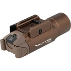 Dimensions: 3.55" x 1.44" x 1.33". Weapon mountable. Water resistant. Impact resistant. LEP WML Light. Modes: High (250 lumens, 4m runtime); Low (60 lumens, 180m runtime). Rear switches. 530m beam distance. Includes: Picatinny rail mount adapter, Allen wrench, and (2) adjustable screws. Requires (2) CR123A batteries (included). Aluminum construction. Color: Tan. Boxed.